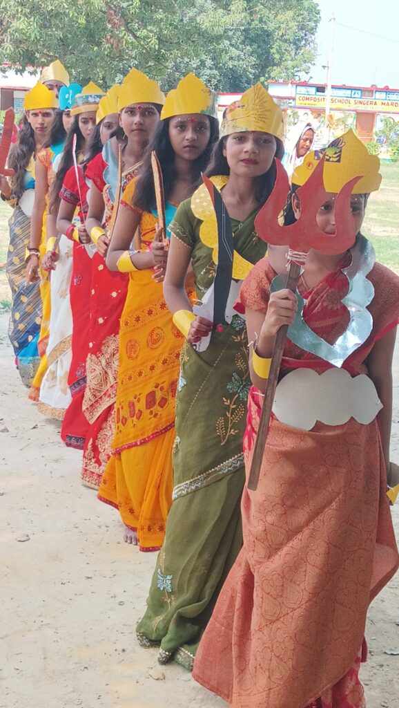 गाजीपुर। विकास खंड मरदह के पीएम श्री विद्यालय सिंगेरा में सोमवार को मिशन शक्ति अभियान के अंतर्गत बच्चों द्वारा विविध गतिविधियों का आयोजन किया गया। कार्यक्रम में मुख्य रूप से मीना मंच की बालिकाओं ने अपनी प्रस्तुतियों से सभी का मन मोह लिया। इसके अतिरिक्त विद्यालय की समस्त कक्षाओं में अध्ययनरत बालिकाओं ने मातृ शक्ति दुर्गा के नवरूपों का अभिनय कर रोचक कार्यक्रम प्रस्तुत किए।