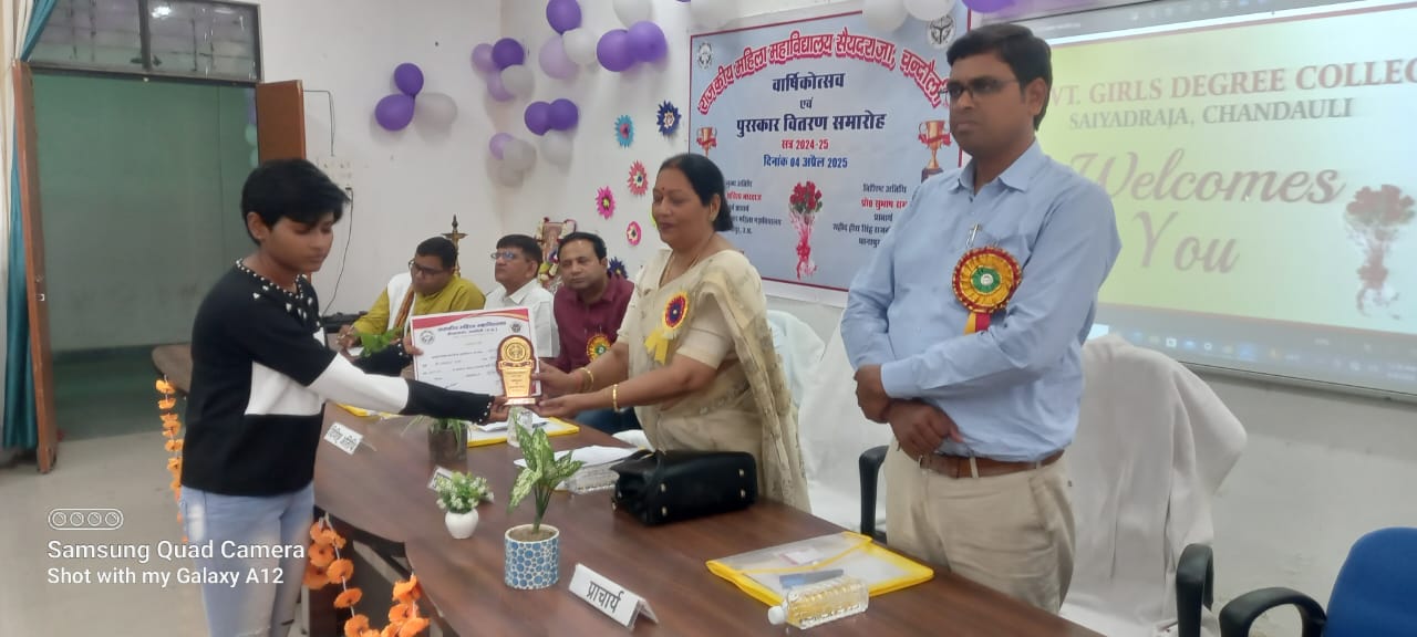 सैयदराजा (चंदौली)। आदर्श नगर पंचायत अंतर्गत राजकीय महिला महाविद्यालय, सैयदराजा में भव्य तृतीय वार्षिकोत्सव एवं पुरस्कार वितरण समारोह का आयोजन किया गया। कार्यक्रम की अध्यक्षता महाविद्यालय के प्राचार्य प्रो. नरेंद्र प्रताप गुप्ता ने की। कार्यक्रम में मुख्य अतिथि के रूप में राजकीय स्नातकोत्तर महिला महाविद्यालय गाज़ीपुर की पूर्व प्राचार्या प्रो. सविता भारद्वाज तथा विशिष्ट अतिथि के रूप में प्रो. सुभाष राम, प्राचार्य शहीद हीरा सिंह राजकीय महाविद्यालय, धानापुर एवं डॉ. अशोक कुमार यादव, राजकीय महाविद्यालय नौगढ़ उपस्थित रहे।