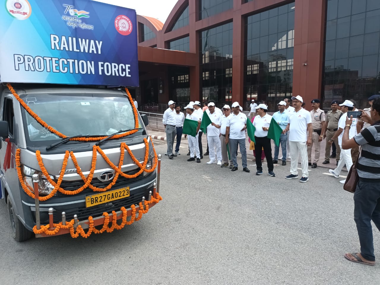 इसी क्रम में शुक्रवार को सुबह 09:30बजे बनारस स्टेशन के सेकेण्ड इन्ट्री पर रेलवे सुरक्षा बल जवानों के बैण्ड,मोटरसाइकिल रैली एवं एल ई डी विडियो वाहन को मंडल रेल प्रबंधक रामाश्रय पाण्डेय हरी झंडी दिखाकर रवाना किया।