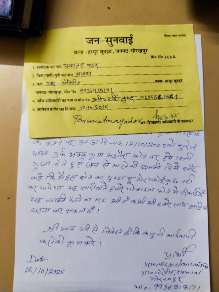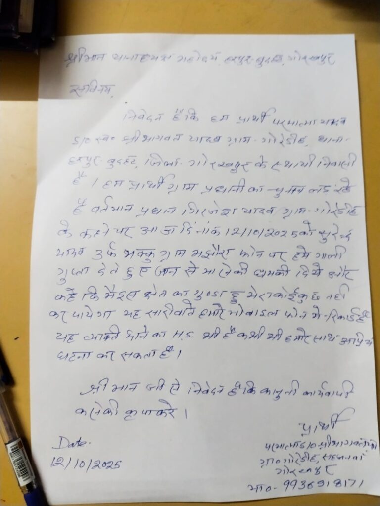 गोरखपुर। जिले के हरपुर बुदहट थाना क्षेत्र के ग्राम पंचायत गोरेडीह निवासी परमात्मा यादव पुत्र श्री भागवत यादव भावी ग्राम प्रधान पद के प्रत्याशी हैं। भावी प्रधान पद प्रत्याशी को ग्राम पंचायत मझौरा निवासी हरपुर-बुदहट थाने का हिस्ट्रीशीटर वर्तमान ग्राम प्रधान गोरेडीह गिरजेश यादव के खिलाफ चुनाव लड़ने को लेकर बीते रविवार को मोबाइल फोन पर जान से मारने की धमकी दिया गया है। जिसका ऑडियो इंटरनेट मीडिया पर वायरल हो रहा है। पीड़ित प्रधान पद प्रत्याशी ने अपने और परिवार की जान माल की सुरक्षा की गुहार लगाते हुए पुलिस को तहरीर दे दी गई है। तहरीर मिलते ही थानाध्यक्ष विवेक कुमार मिश्र ने मामले को गंभीरता से संज्ञान में लेते हुए जांच पड़ताल में जुट गए हैं।