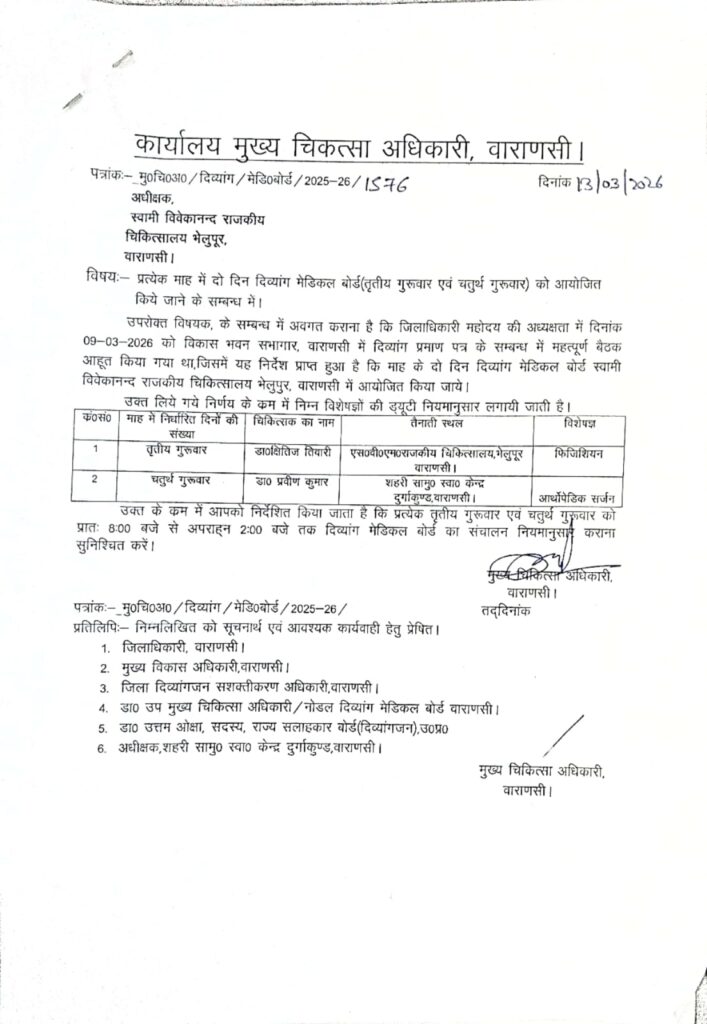 वाराणसी। स्वामी विवेकानंद मंडलीय हॉस्पिटल, भेलूपुर में अब दिव्यांगजनों के दिव्यांग प्रमाण पत्र बनाए जाएंगे। जिला दिव्यांग सलाहकार बोर्ड की बैठक में दिव्यांग बंधु डॉ. उत्तम ओझा द्वारा उठाई गई मांग के क्रम में मुख्य चिकित्सा अधिकारी वाराणसी ने पत्र जारी कर इसकी जानकारी दी है। जारी पत्र के अनुसार प्रत्येक माह के तृतीय और चतुर्थ गुरुवार को सुबह 10 बजे से दोपहर 2 बजे तक स्वामी विवेकानंद मंडलीय हॉस्पिटल, भेलूपुर चौराहे पर दिव्यांगजनों के प्रमाण पत्र बनाए जाएंगे।