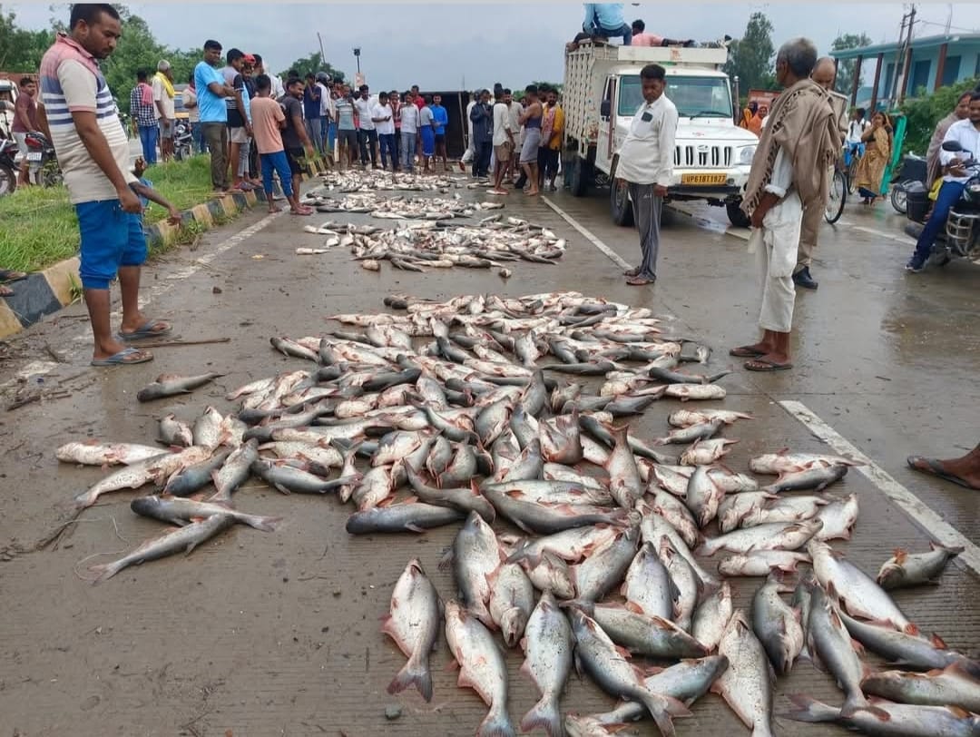 मछलियों से लदी पिकअप पलटी