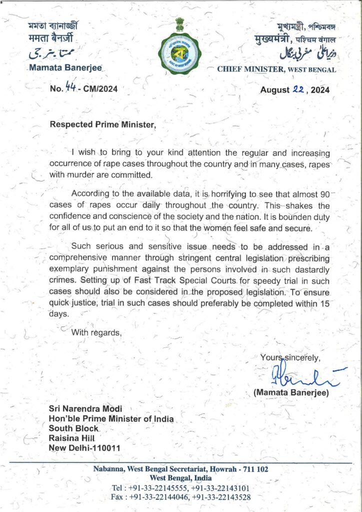 देश भर में बलात्कार के मामलों की नियमित घटना पर ध्यान देते हुए, ममता बनर्जी ने चिट्ठी में लिखा है कि, उपलब्ध आंकड़ों के अनुसार, लगभग 90 बलात्कार के मामले प्रतिदिन होते हैं। कई मामलों में, बलात्कार पीड़ितों की हत्या भी कर दी जाती है। अपराधियों के इस प्रवृत्ति को देखना भयावह है। यह समाज और राष्ट्र के आत्मविश्वास और विवेक को झकझोरता है, इसे समाप्त करना हमारा कर्तव्य है ताकि महिलाएं सुरक्षित महसूस करें। इस तरह के गंभीर और संवेदनशील मुद्दे को कड़े केंद्रीय कानून के माध्यम से व्यापक रूप से संबोधित करने की जरूरत है जो इन नृशंस अपराधों में शामिल लोगों के लिए ऐसी सजा का प्रावधान करे जो दूसरों के लिए उदाहरण बन जाए।