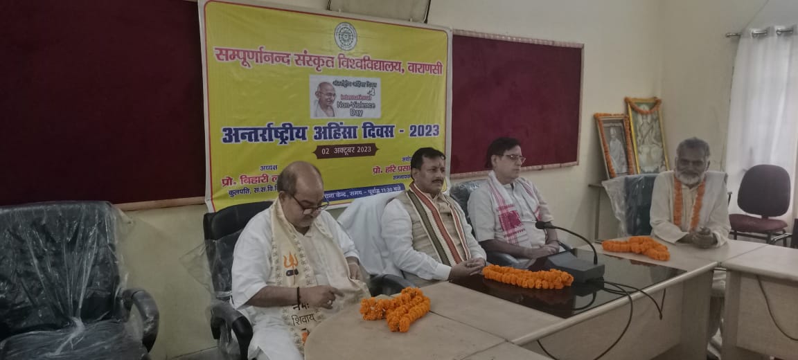 वाराणसी। संपूर्णानंद संस्कृत विश्वविद्यालय,वाराणसी में राष्ट्रपिता महात्मा गांधी की जयंती एवं अंतर्राष्ट्रीय अहिंसा दिवस के उपलक्ष्य में विश्वविद्यालय परिसर स्थित राष्ट्रीय परिचर्चा का समायोजन किया गया। परिचर्चा की अध्यक्षता करते हुए विश्वविद्यालय के कुलपति प्रोफेसर बिहारी लाल शर्मा जी ने महात्मा गांधी के व्यक्तित्व एवं कृतित्व की चर्चा करते हुए प्रत्येक नागरिक को भय व स्वार्थ से मुक्त होने तथा मानवता की रक्षा हेतु निरंतर प्रयत्नशील रहने के लिए प्रेरित किया इसी क्रम में महात्मा गांधी के विराट व्यक्तित्व एवं राष्ट्रीय अवदान को भी स्मरण किया तथा पूर्व प्रधानमन्त्री लालबहादुर शास्त्री के जयंती पर कहा कि भागीरथी के तट पर जन्म लेने वाले शास्त्री जी माँ गंगा की तरह निर्मल और शीतल रहे ,सदैव जनहित मे समर्पित रहे.