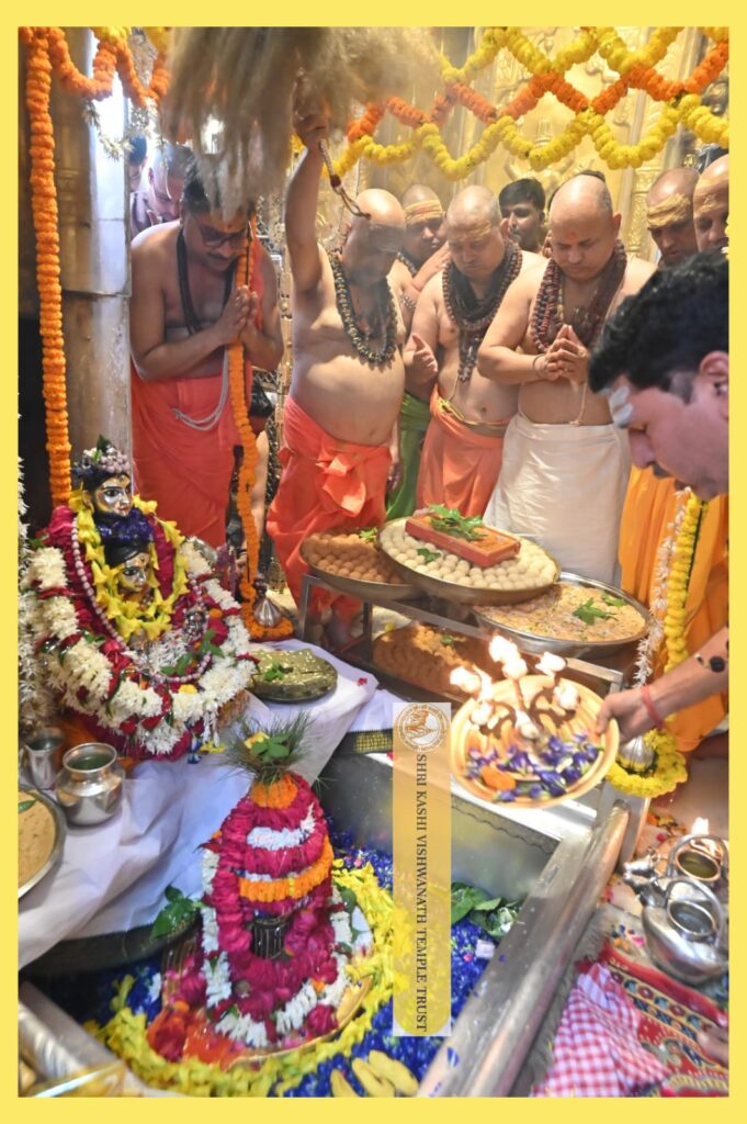 धाम परिसर में श्री विश्वेश्वर महादेव का शृंगार 21 क्विंटल मिष्ठान्नों से किया गया, जो विभिन्न प्रतिष्ठानों द्वारा अर्पित किया गया था। साथ ही, माता गौरी और गणेशजी की पंचबदन रजत चल-प्रतिमा की भव्य शोभायात्रा टेढ़ीनीम स्थित महंत आवास से प्रारंभ होकर शहनाई, डमरू की मंगल ध्वनि और ‘हर-हर महादेव’ के जयघोष के बीच गर्भगृह तक पहुंची।