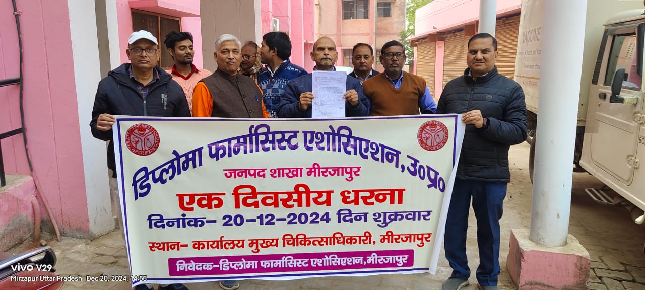 डिप्लोमा फार्मासिस्ट एसोसिएशन की मिर्जापुर इकाई ने शुक्रवार को मुख्य चिकित्सा अधिकारी (सीएमओ) कार्यालय पर जोरदार प्रदर्शन करते हुए उत्तर प्रदेश के मुख्यमंत्री योगी आदित्यनाथ को ज्ञापन सौंपा। ज्ञापन मुख्य चिकित्सा अधिकारी के माध्यम से भेजा गया।