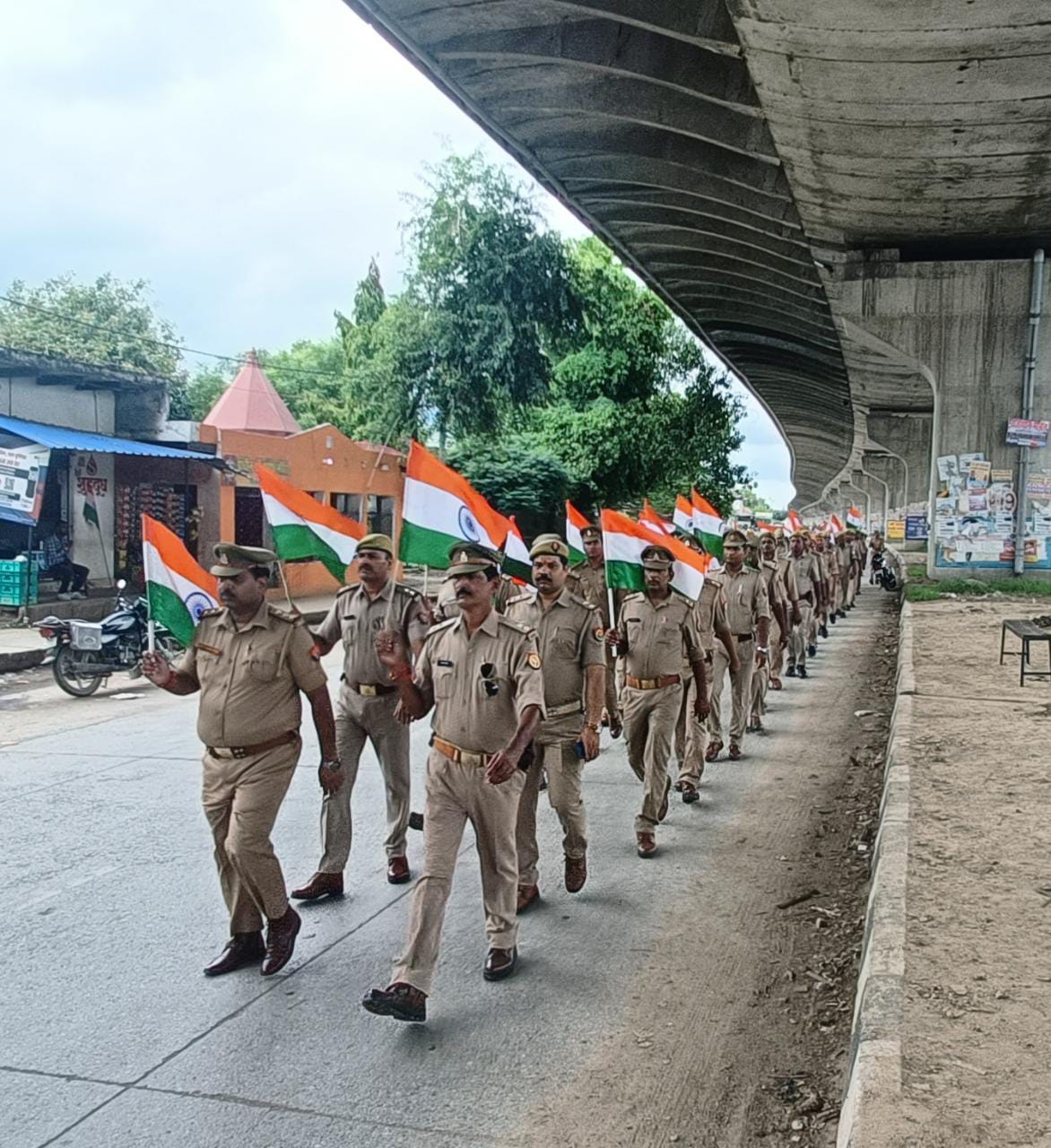 मिर्जामुराद थाना प्रभारी राजीव कुमार सिंह के नेतृत्व में पुलिसकर्मियों ने निकाला तिरंगा यात्रा