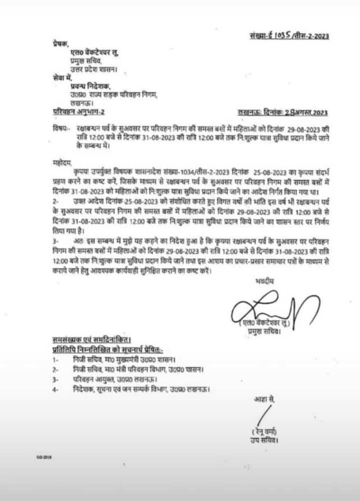 योगी सरकार द्वारा परिवहन विभाग को जारी किए गए आदेश के अनुसार 29 अगस्त की रात्रि 12 बजे से 31 अगस्त की रात्रि 12 बजे तक पूरे यूपी में महिलाओं से किराया नहीं लिया जाएगा।