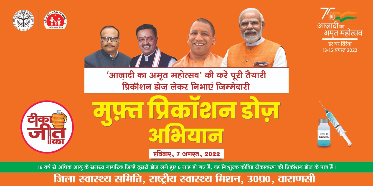 वाराणसी| आजादी के अमृत महोत्सव के अंतर्गत कोविड टीके की मुफ्त एहतियाती (प्रीकॉशन) डोज को लेकर 15 जुलाई से स्वास्थ्य विभाग द्वारा 30 सितंबर तक विशेष अभियान चलाया जा रहा है। इसके तहत 18 वर्ष से अधिक उम्र के सभी लोगों को सरकारी कोविड टीकाकरण केंद्रों पर कोविड टीके की एहतियाती डोज मुफ्त लगाई जा रही है। अब इस अभियान को और गति देने के लिए सात अगस्त (रविवार) को एहतियाती डोज के लिए मेगा कैंप लगाया जाएगा।