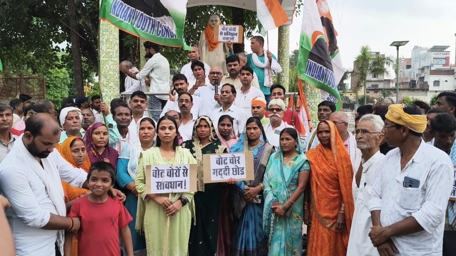 रसड़ा (बलिया)। नगर के भगत सिंह तिराहे से कांग्रेस कार्यकर्ताओं ने सरकार के विरोध में पदयात्रा निकाली। इस दौरान कार्यकर्ताओं ने “वोट चोर गद्दी छोड़” जैसे नारे लगाए और गांधी पार्क मैदान तक मार्च करते हुए चुनाव आयोग और सरकार पर गंभीर आरोप लगाए।