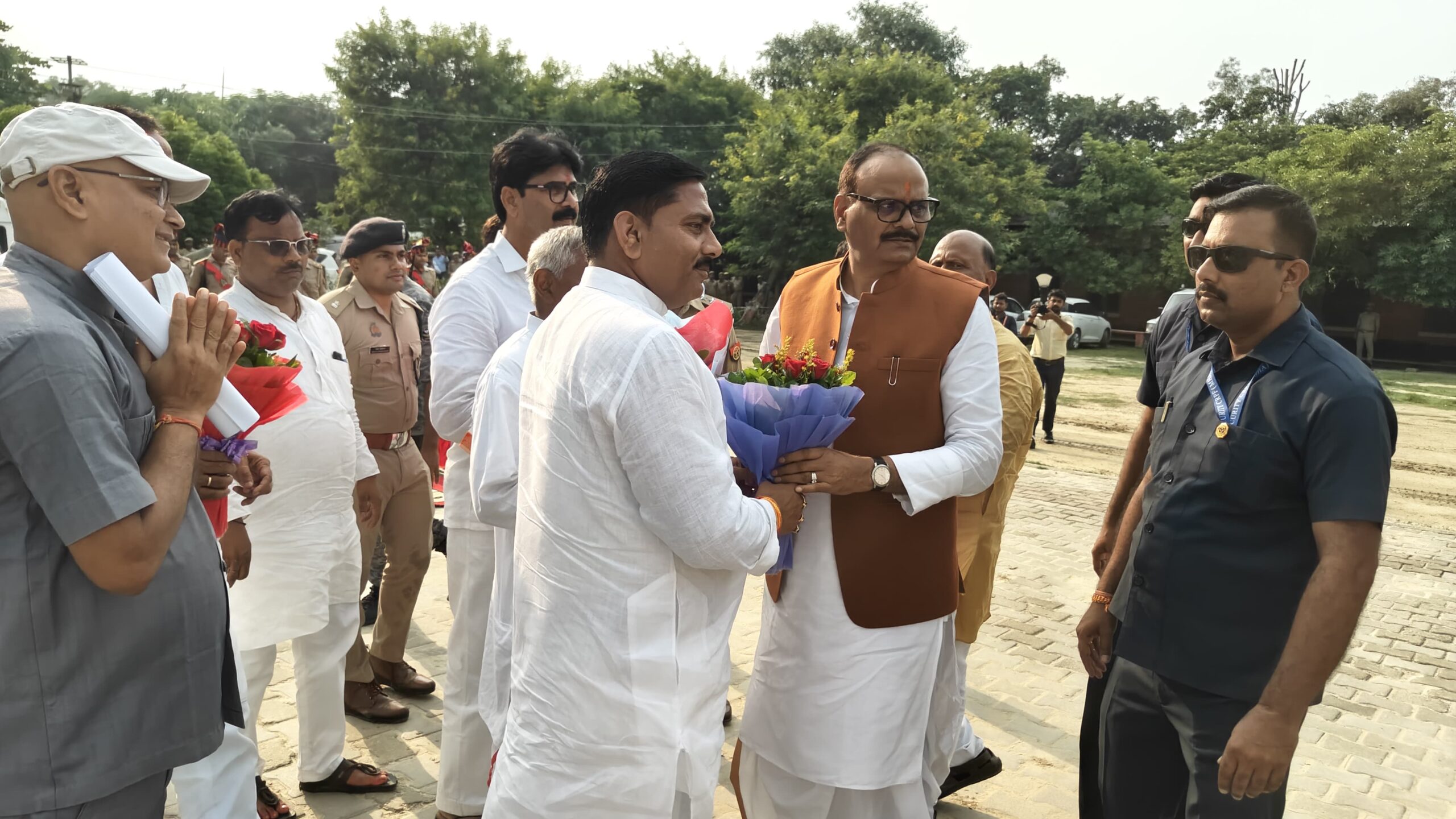 चंदौली/पीडीडीयू नगर। मिनी महानगर में मंगलवार को राष्ट्रकवि रामधारी सिंह दिनकर की जयंती में शामिल होने उपमुख्यमंत्री बृजेश पाठक का आगमन हुआ। इस दौरान विधायक चकिया कैलाश आचार्य, विधायक रमेश जायसवाल, भाजपा जिलाध्यक्ष काशीनाथ सिंह, जिलाधिकारी चंद्र मोहन गर्ग, पुलिस अधीक्षक आदित्य लांग्हे सहित अन्य लोगों द्वारा हेलीपैड पर पुष्पगुच्छ देकर स्वागत किया गया।