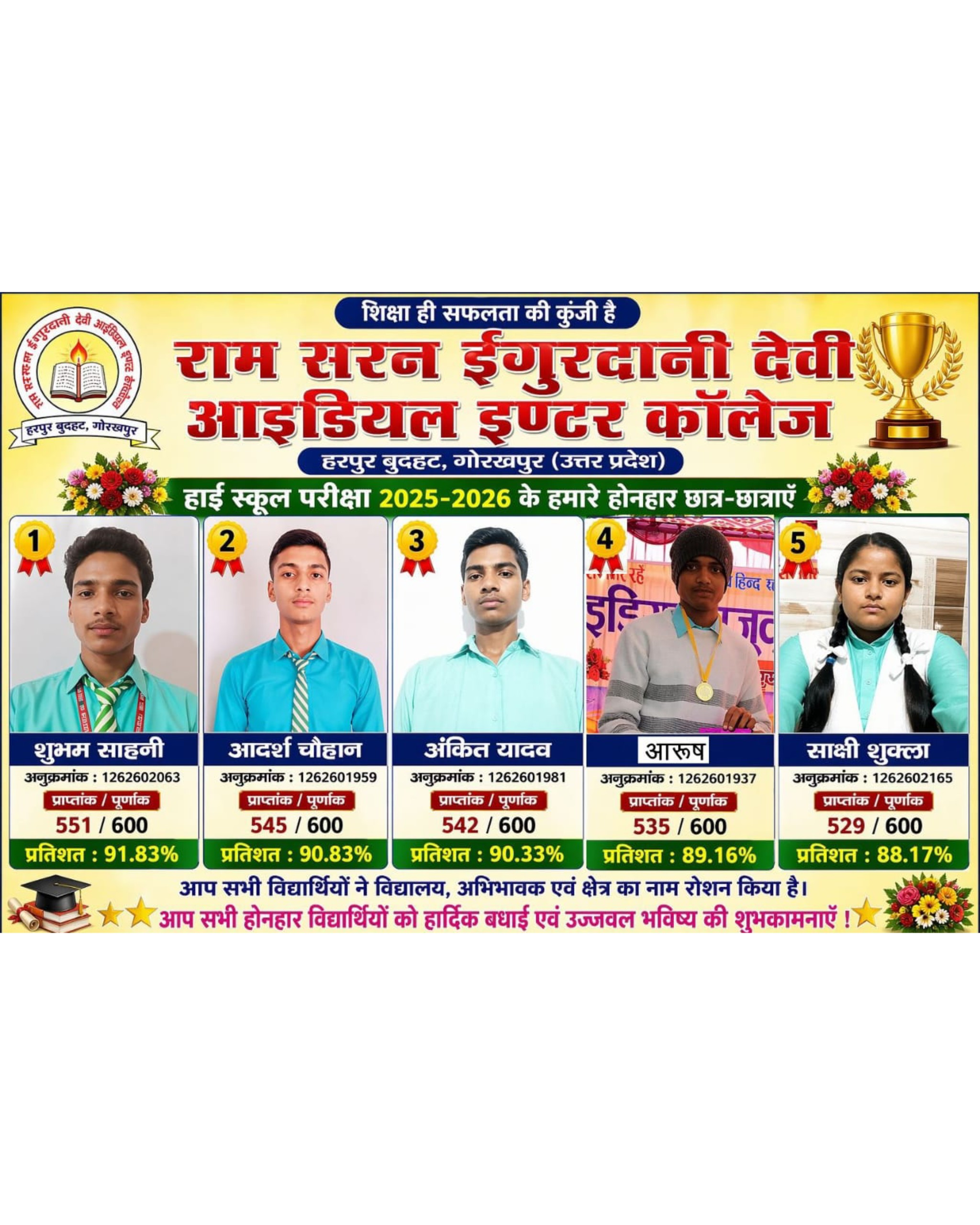हरपुर बुदहट (गोरखपुर)। रामसरन इंगुरदानी देवी आइडियल इंटर कॉलेज के विद्यार्थियों ने परीक्षा में उत्कृष्ट प्रदर्शन कर विद्यालय और क्षेत्र का गौरव बढ़ाया है। कई छात्रों ने 90 प्रतिशत से अधिक अंक हासिल कर उल्लेखनीय सफलता दर्ज की।