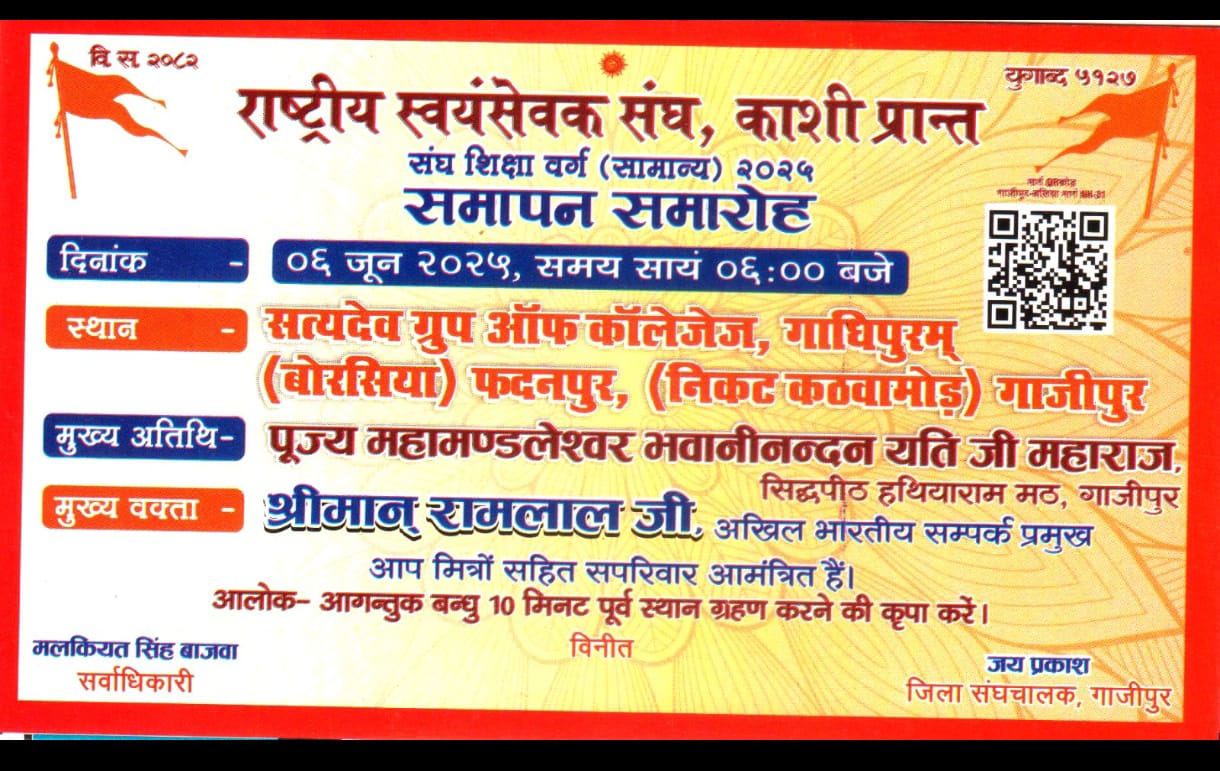 गाजीपुर। राष्ट्रीय स्वयंसेवक संघ, काशी प्रान्त द्वारा आयोजित संघ शिक्षा वर्ग (सामान्य) 2025 का समापन समारोह आज सायं 6:00 बजे सत्यदेव ग्रुप ऑफ कॉलेजेज, गाधिपुरम् (बोरसिया), फदनपुर स्थित परिसर में सम्पन्न होगा। यह स्थान कठवामोड़ के निकट अवस्थित है।