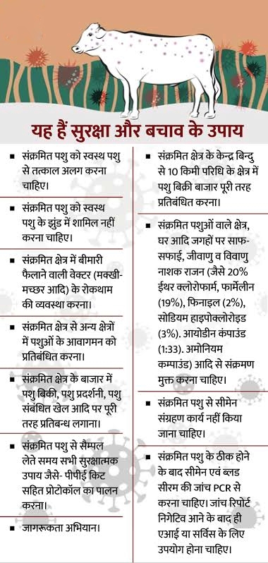 उन्होंने बताया कि बीमारी से ग्रसित पशुओं को स्वस्थ पशुओं से अलग रखना। पशुओं में बीमारी को फैलाने वाले घटकों की संख्या को रोकना अर्थात पशुओं को मक्खी, चिचडी एवं मच्छर के काटने से बचाना, पशुशाला की साफसफई दैनिक रूप से करना तथा डिसइन्फेक्शन का स्प्रे आदि करना चाहिए। संकमित स्थान की दिन में कई बार फार्मलिन, ईथर, क्लोरोफार्म, एल्कोहल से सफाई करना। मृत पशुओं के शव को गहरे गडढे में दबाया जाना चाहिए।