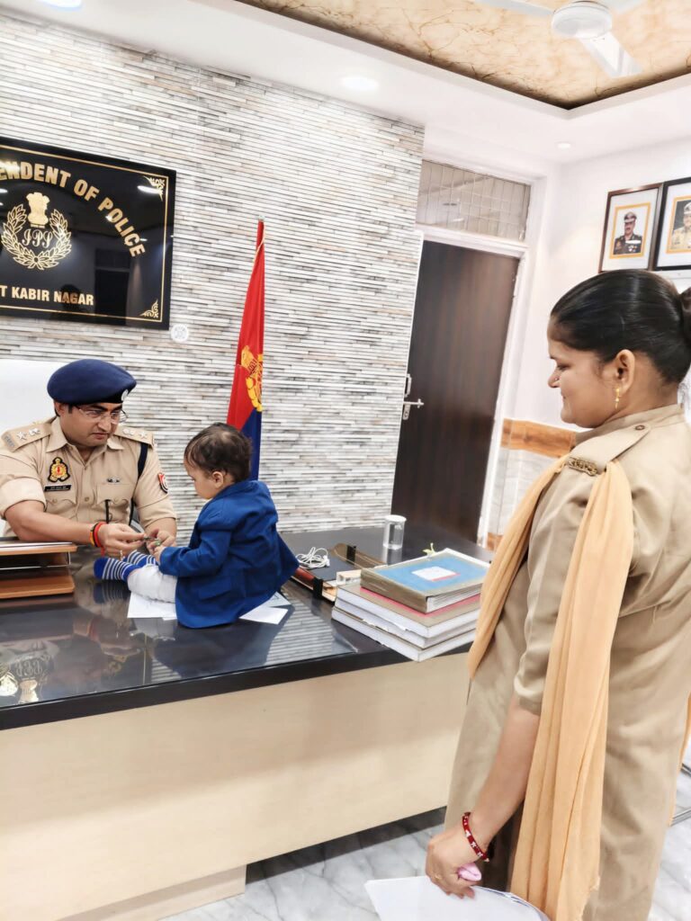 संत कबीर नगर। जनसुनवाई के दौरान पुलिस अधीक्षक कार्यालय में एक महिला कांस्टेबल अपने बच्चे के साथ अवकाश हेतु पुलिस अधीक्षक के समक्ष प्रस्तुत हुई। इस पर पुलिस अधीक्षक ने बच्चे को गोद में लेकर बहुत ही लाड़-प्यार से पुचकारा।