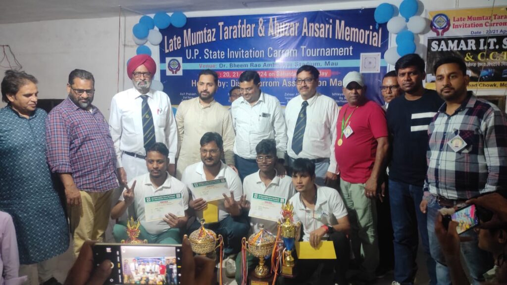 मऊ। उत्तर प्रदेश कैरम एसोसिएशन के तत्वावधान में जिला कैरम एसोसिएशन मउ द्वारा चन्दन पैलेस मऊ में आयोजित दो दिवसीय *स्वर्गीय मुमताज़ तरफदार व अबुजर अंसारी मेमोरियल यूपी स्टेट इनविटेशन कैरम टूर्नामेंट के रविवार को खेले गए फ़ाइनल मुकाबले में उत्तर प्रदेश ने टॉप सीड खिलाड़ी लखनऊ के मोहम्मद आरिफ ने सीधे दो सेटों में वाराणसी के कृष्ण दयाल यादव को 25-12, 25-00 से हराकर विजेता ट्राफी पर कब्ज़ा जमाया।
