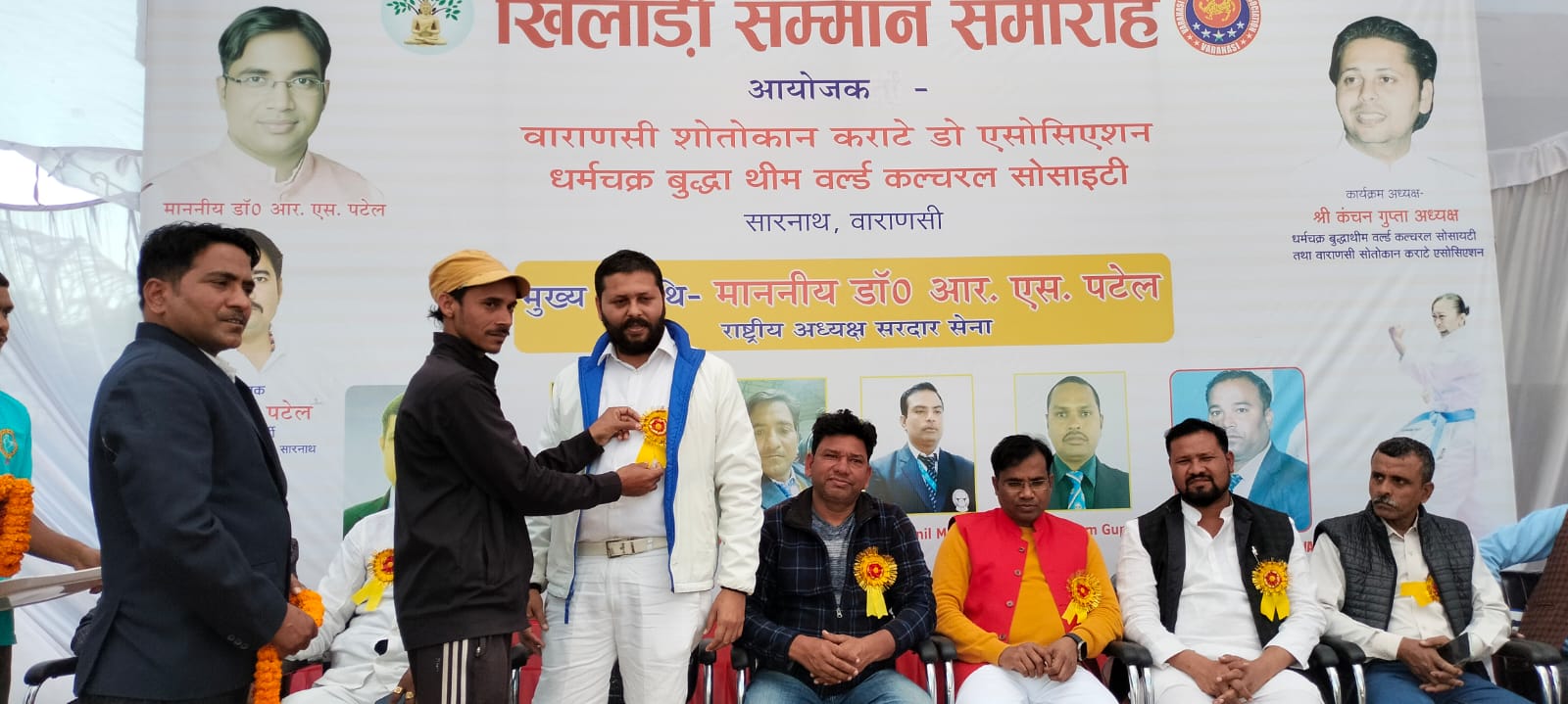 वाराणसी। सारनाथ धर्मचक्र बुद्धि थीम वर्ल्ड कल्चरल सोसायटी तथा वाराणसी सोतोकान कराटे एसोसिएशन के संयुक्त तत्वधान में राष्ट्रीय खिलाड़ी सम्मान समारोह का कार्यक्रम होटल लोटस इन के स्थित पार्क में किया गया। इस कार्यक्रम में मुख्य अतिथि के रूप में सरदार सेना के राष्ट्रीय अध्यक्ष आर एस पटेल व कार्यक्रम के अध्यक्ष कंचन गुप्ता तथा वाराणसी सोतोकान कराटे एसोसिएशन के संयोजक जयप्रकाश (जेपी) पटेल उपस्थित रहे।