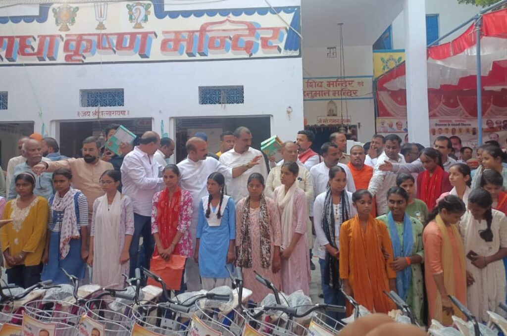 कार्यक्रम के दौरान 25 गरीब बच्चियों को साइकिल वितरित की गई। विधायक के आगमन पर वेद वेदांग पाठशाला के बटुकों ने वैदिक मंत्रोच्चारण कर समारोह का शुभारंभ किया, जिससे पूरा वातावरण भक्तिमय हो उठा।