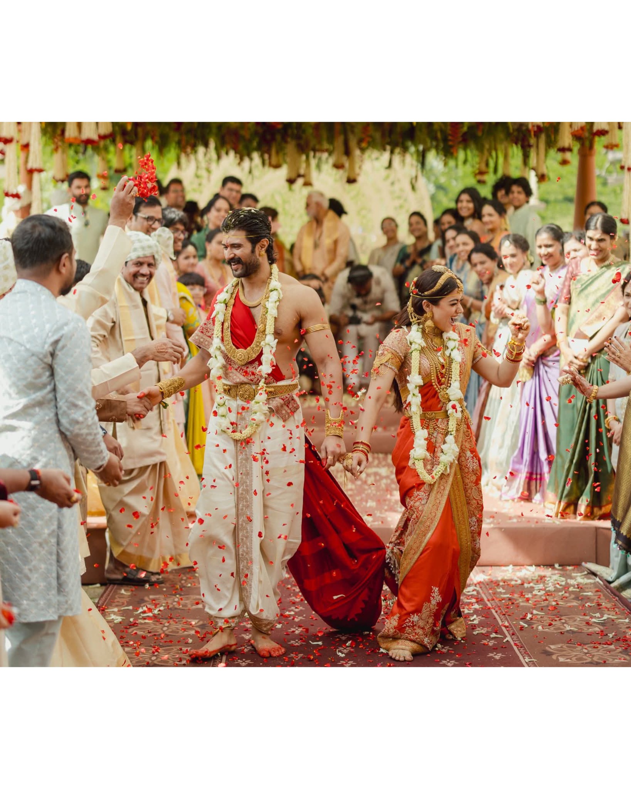 विजय देवरकोंडा और रश्मिका मंदाना ने पारंपरिक तेलुगु रीति-रिवाजों के अनुसार विवाह किया, इसके बाद कोडवा परंपरा के तहत भी सात फेरे लिए। शादी समारोह उदयपुर स्थित आईटीसी मेमेंटोस में आयोजित हुआ। तस्वीरों में दोनों शाही अंदाज में दिखाई दे रहे हैं। रश्मिका ने यह भी साझा किया कि उनके सपनों के राजकुमार घोड़े पर सवार होकर बारात लेकर पहुंचे थे। समारोह की तस्वीरें सामने आने के बाद सोशल मीडिया पर इस नवविवाहित जोड़े को लगातार बधाइयां मिल रही हैं।