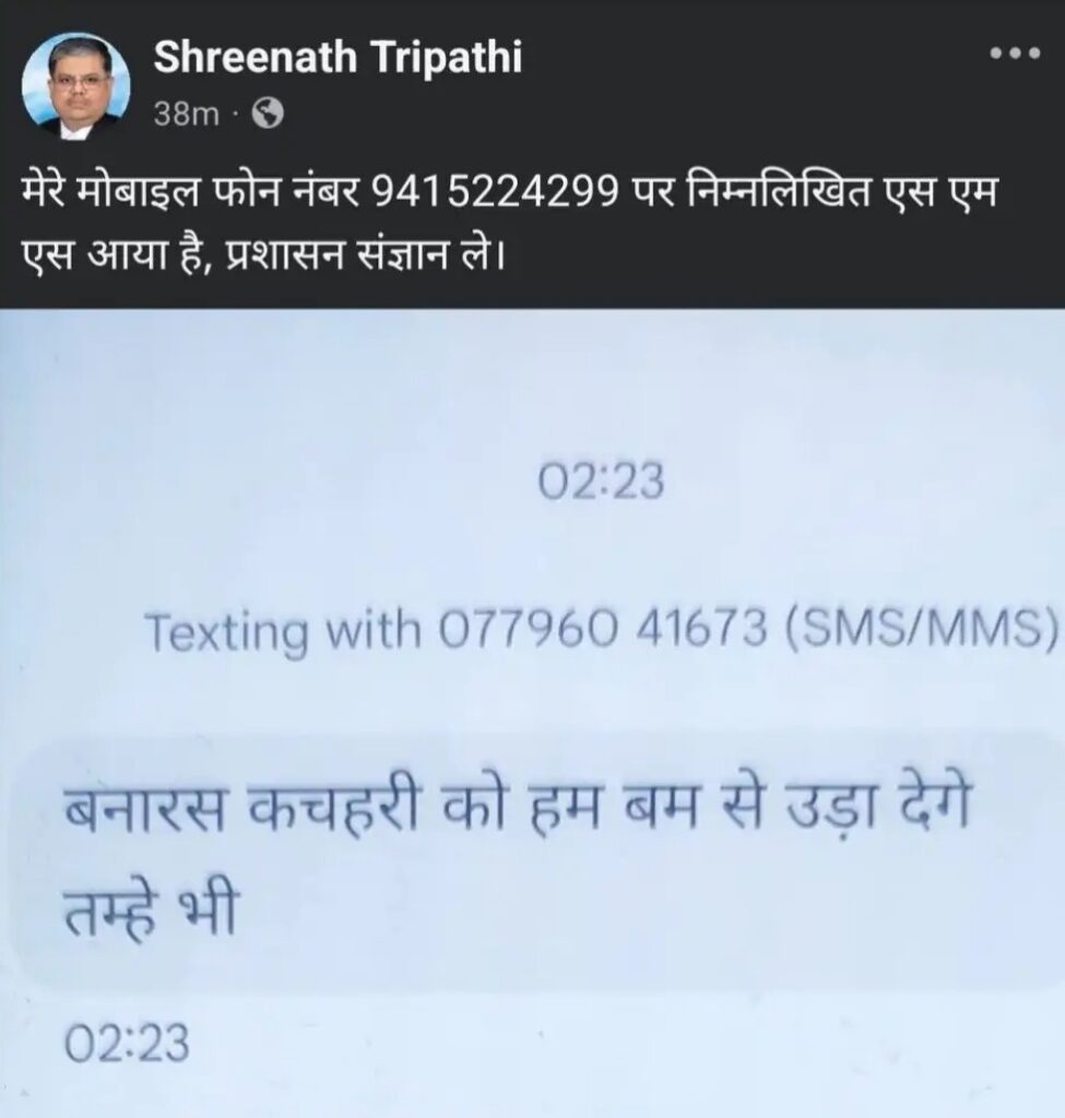 गत सुबह 2 बजकर 23 मिनट पर श्रीनाथ त्रिपाठी के मोबाइल नंबर पर एक अज्ञात नंबर 077960 41673 से संदेश प्राप्त हुआ। मैसेज में लिखा था, “बनारस कचहरी को हम बम से उड़ा देंगे तुम्हें भी।” सुबह नींद से उठकर जब उन्होंने मोबाइल देखा तो यह संदेश नजर आया। इसके बाद उन्होंने तत्काल उच्चाधिकारियों को सूचना दी और कचहरी पहुंच गए। उन्होंने बताया कि लगभग 11 बजे पुलिस अधिकारियों ने उनसे मुलाकात कर आश्वासन दिया था कि आरोपी को शीघ्र गिरफ्तार कर लिया जाएगा।