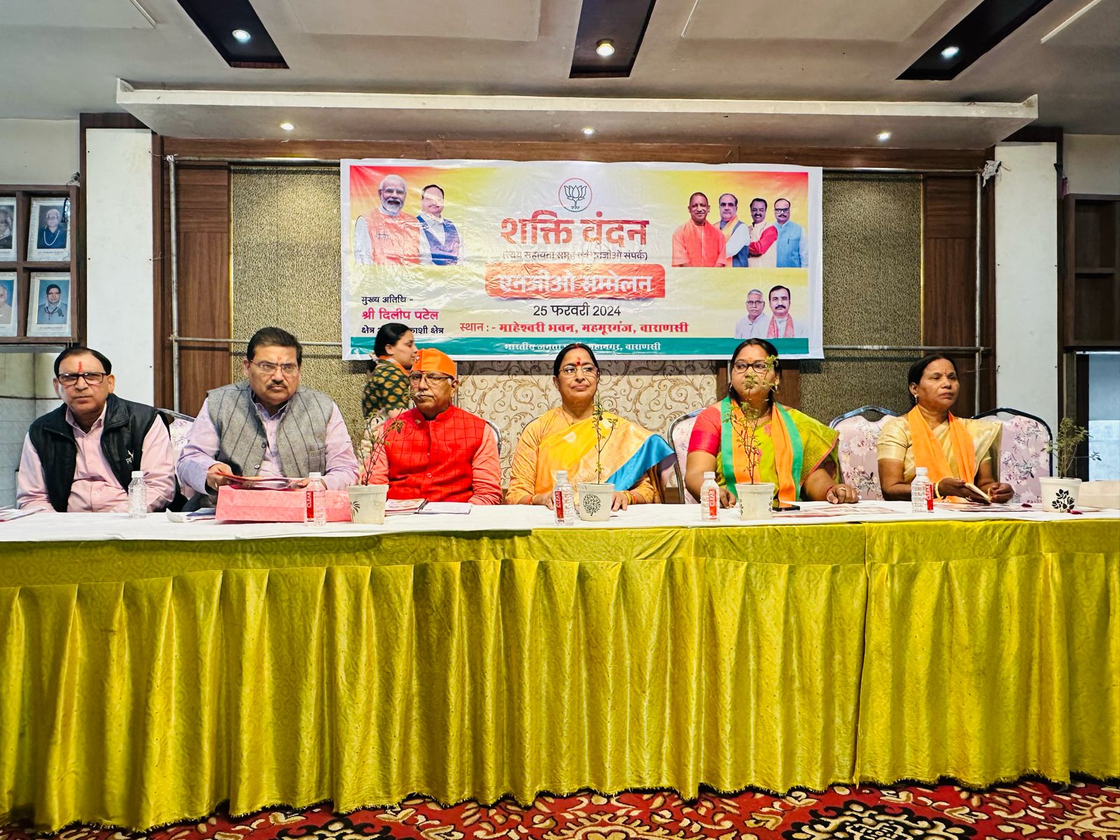 वाराणसी। भारतीय जनता पार्टी महिला मोर्चा द्वारा रविवार को माहेश्वरी भवन, महमूरगंज में “शक्ति वंदन” अभियान के तहत एनजीओ सम्मेलन संपन्न हुआ।भाजपा महानगर अध्यक्ष विद्यासागर राय की अध्यक्षता में संपन्न हुए कार्यक्रम के मुख्य वक्ता अशोक सहगल उपस्थित रहे।समारोह की मुख्य अतिथि भाजपा प्रदेश मंत्री मीना चौबे ने केंद्र सरकार द्वारा 10 सालों में महिलाओं को मिल रही सभी योजनाओं को गिनवाया। उन्होंने कहा कि प्रधानमंत्री नरेंद्र मोदी के नेतृत्व में केंद्र की भाजपा सरकार ने महिलाओं को सशक्त समृद्धिशाली व आत्मनिर्भर बनाया है।