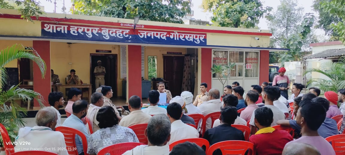 गोरखपुर। आगामी त्योहार को लेकर हरपुर बुदहट थानाध्यक्ष विवेक मिश्रा की अध्यक्षता में थाना परिसर में बुधवार को पीस कमेटी की बैठक की गई। बैठक में लक्ष्मी प्रतिमा स्थापित करने वाले आयोजक, डीजे संचालक, मूर्तिकार सहित दोनों समुदायों के लोग उपस्थित रहे।