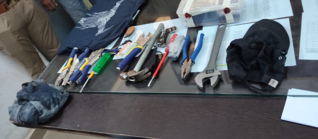 पुलिस ने आरोपी के पास से 27 हजार रुपये नकद, तीन गले हुए सोने के टुकड़े (26.650 ग्राम), तीन लॉक कटर, एक हथौड़ी, दो पेचकश, एक पिलास, एक घड़ी, एक इलेक्ट्रॉनिक तराजू, एक स्कूटी, एक थार, दो मोबाइल, आधार कार्ड, प्रिंटेड टी-शर्ट, काला मास्क, काली टोपी, एक टॉर्च और एक रिंच बरामद किया।