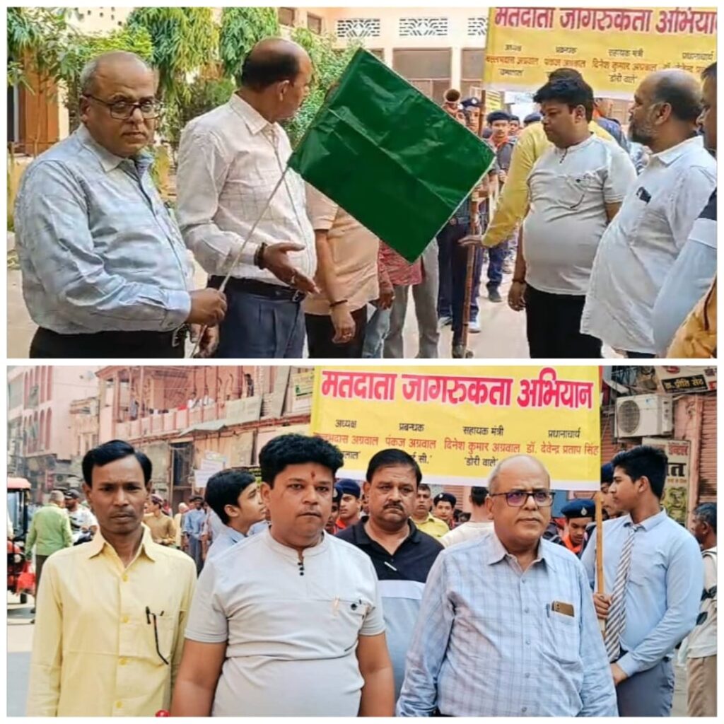 वाराणसी। श्री काशी अग्रवाल समाज वाराणसी द्वारा संचालित श्री अग्रसेन महाजनी महाविद्यालय इण्टर कॉलेज, चौखम्भा, वाराणसी के छात्रों द्वारा गुरुवार 16 मई को प्रातः 8.30 बजे मतदाता जागरूकता अभियान के अन्तर्गत रैली निकाली गई। प्रबंधक पंकज अग्रवाल एल.आई.सी. ने हरी झंडी दिखाकर रैली को रवाना किया।