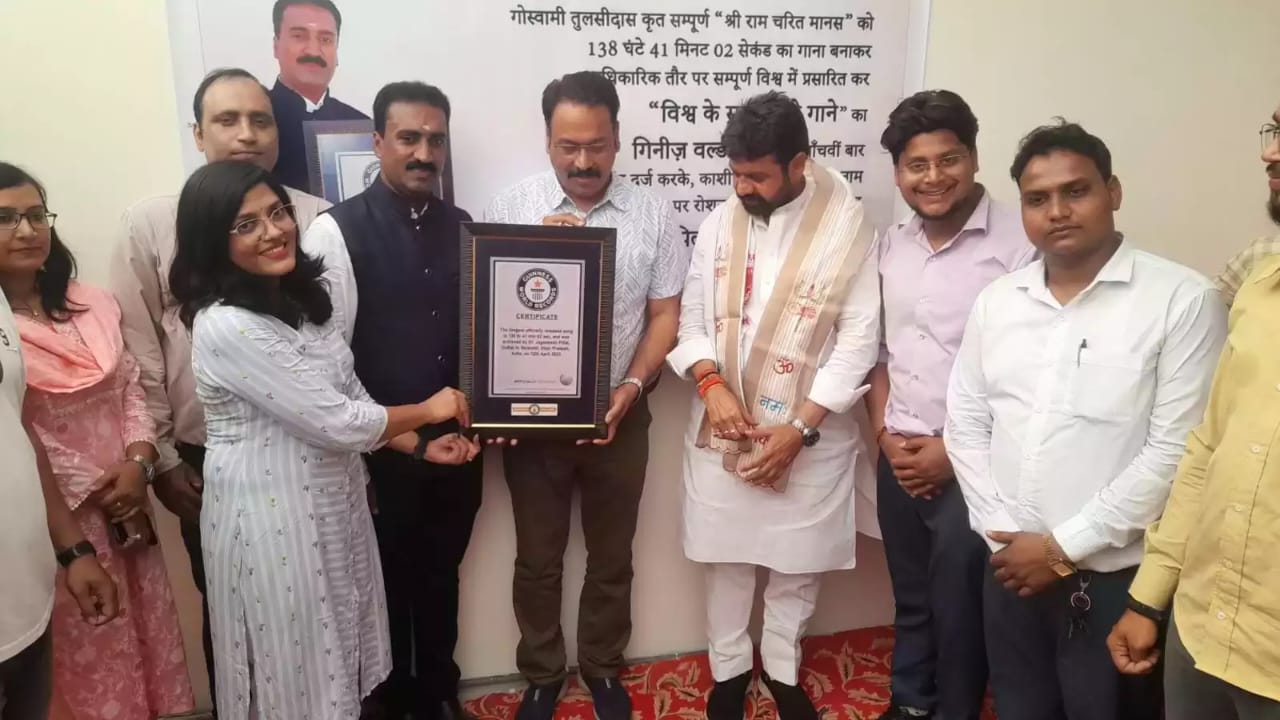 वाराणसी। गोस्वामी तुलसी दास के श्री राम चरित मानस के श्लोकों को गाने के रूप में गाकर वाराणसी के डॉक्टर जगदीश पिल्लई (Dr. Jagdish Pillai) ने वर्ल्ड रिकॉर्ड बना दिया है। दुनिया के सबसे लंबे गाने के रूप में जगदीश पिल्लई के द्वारा बनाए गए गाने को गिनीज बुक में दर्ज किया गया है। जगदीश पिल्लई ने 138 घंटे 41 मिनट 02 सेकेंड का गाना बनाकर आधिकारिक तौर पर दुनिया का सबसे लंबा गाना बनाने की ख्याति प्राप्त की है। इस उपलब्धि के मिलने को लेकर उत्तर प्रदेश सरकार के आयुष एवम खाद्य मंत्री दयाशंकर मिश्र “दयालु” (Dashashankar Mishra) ने जगदीश पिल्लई को बधाई दिया और इस पल को बनारस के लिए बेहद खास बताया।