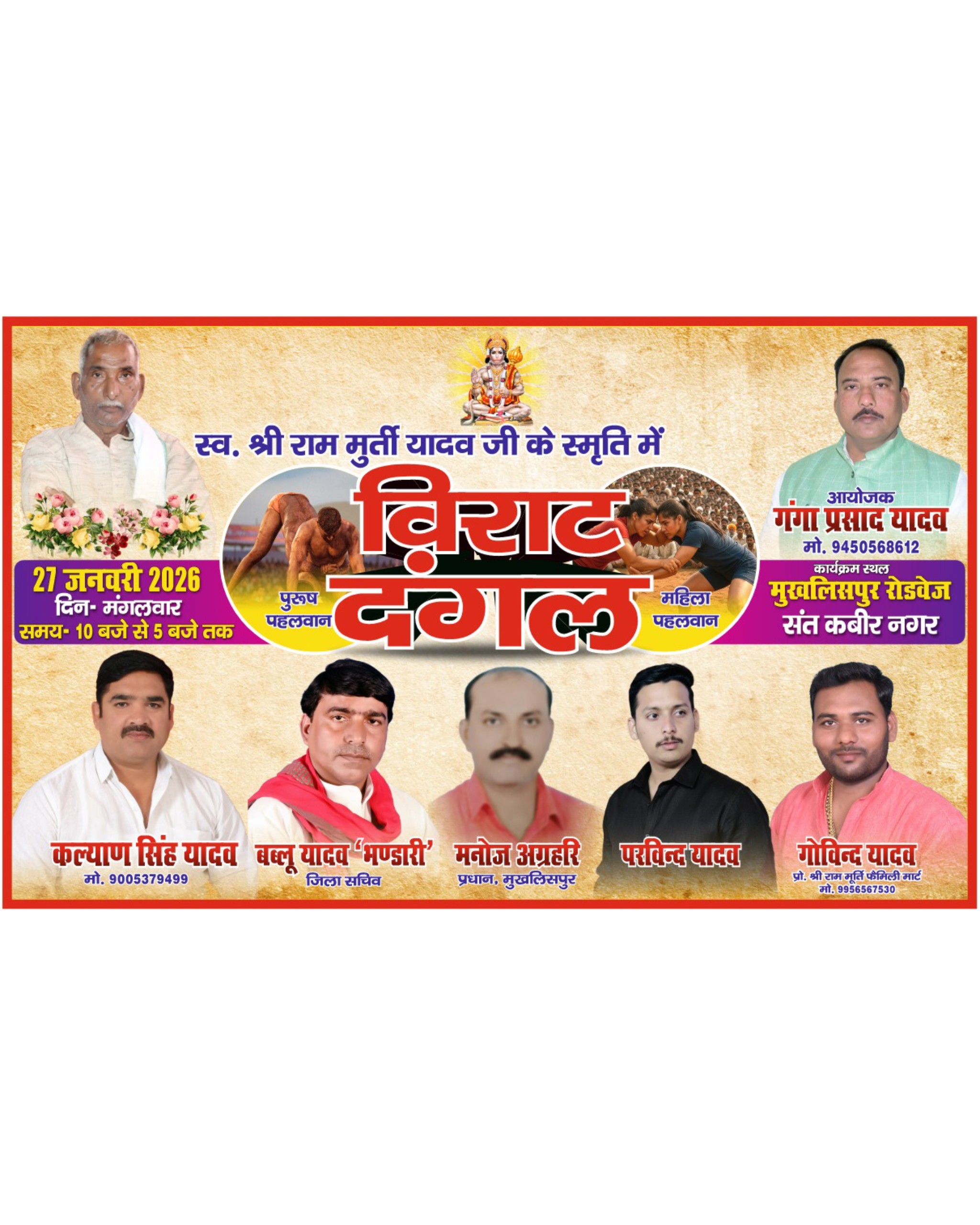 संतकबीर नगर। तहसील धनघटा के विकाश खण्ड नाथनगर अंतर्गत ग्राम पंचायत मुखलिसपुर रोडवेज परिसर में 27 जनवरी 2026, दिन मंगलवार को स्वर्गीय श्री राम मूर्ति यादव की पावन स्मृति में एक विराट दंगल प्रतियोगिता का भव्य आयोजन किया गया है। इस ऐतिहासिक दंगल को लेकर पूरे क्षेत्र में जबरदस्त उत्साह और तैयारियाँ जोरों पर हैं।