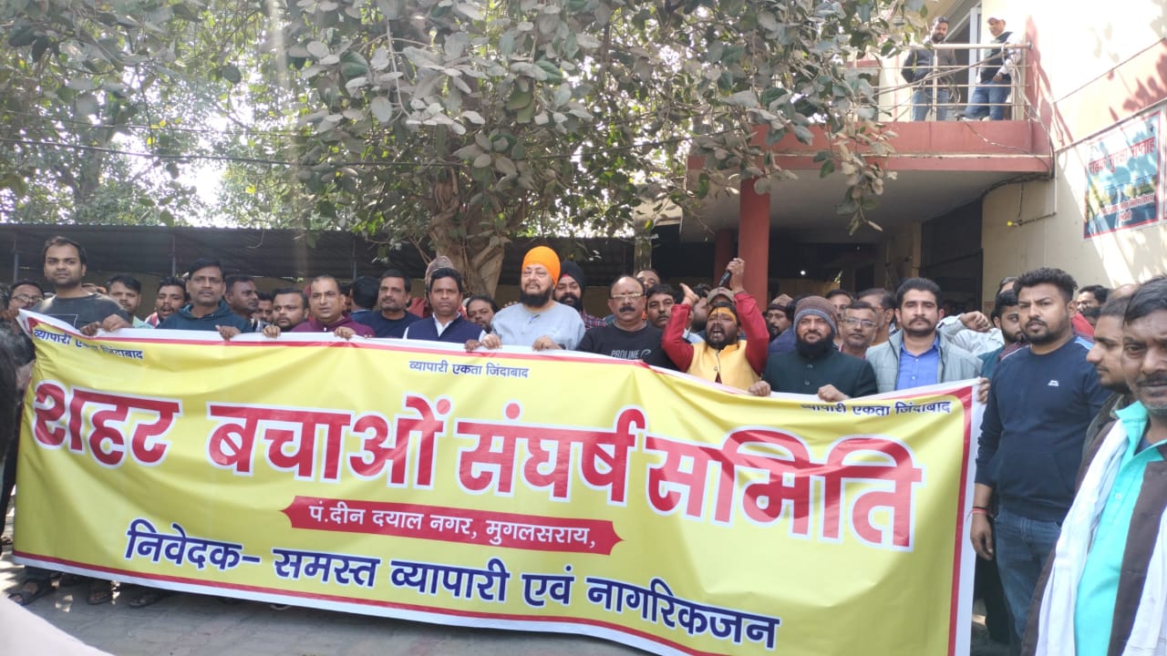 चंदौली। पीडीडीयू नगर के काली मंदिर से जीटी रोड तक के व्यापारी सड़क चौड़ीकरण के खिलाफ सड़कों पर उतर आए। “शहर बचाओ संघर्ष समिति” के बैनर तले व्यापारियों ने प्रातः 10:00 बजे अपने-अपने दुकानों को बंद कर एक मोर्चा निकाला, जो जीटी रोड स्थित समाजवादी पार्टी (सपा) कार्यालय से शुरू होकर पीडब्लूडी कार्यालय तक पहुंचा। इस मोर्चे के दौरान व्यापारियों ने अपनी आवाज़ बुलंद की और चौड़ीकरण की योजना में बदलाव को लेकर चिंता जताई।
