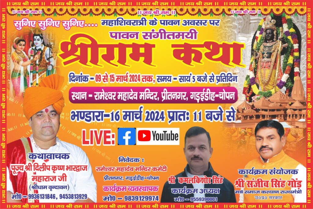 कार्यक्रम संयोजक समाज कल्याण मंत्री संजीव गोड़़ ने बताया कि, विगत कई वर्षों से अथक प्रयास के बाद अयोध्या में राम लला विराजमान हुए हैं। उसी उपलक्ष्य में चोपन स्थित रामेश्वर मंदिर पर सप्त दिवसीय कार्यक्रम का आयोजन किया गया है। जिसमें लोग अधिक से अधिक उपस्थित होकर राम कथा को सुनकर पुण्य के भागी बनें।परम पूज्य अंतरराष्ट्रीय कथावाचक दिलीप कृष्ण भारद्वाज के मुखारविंद से सुनाया जाएगा।