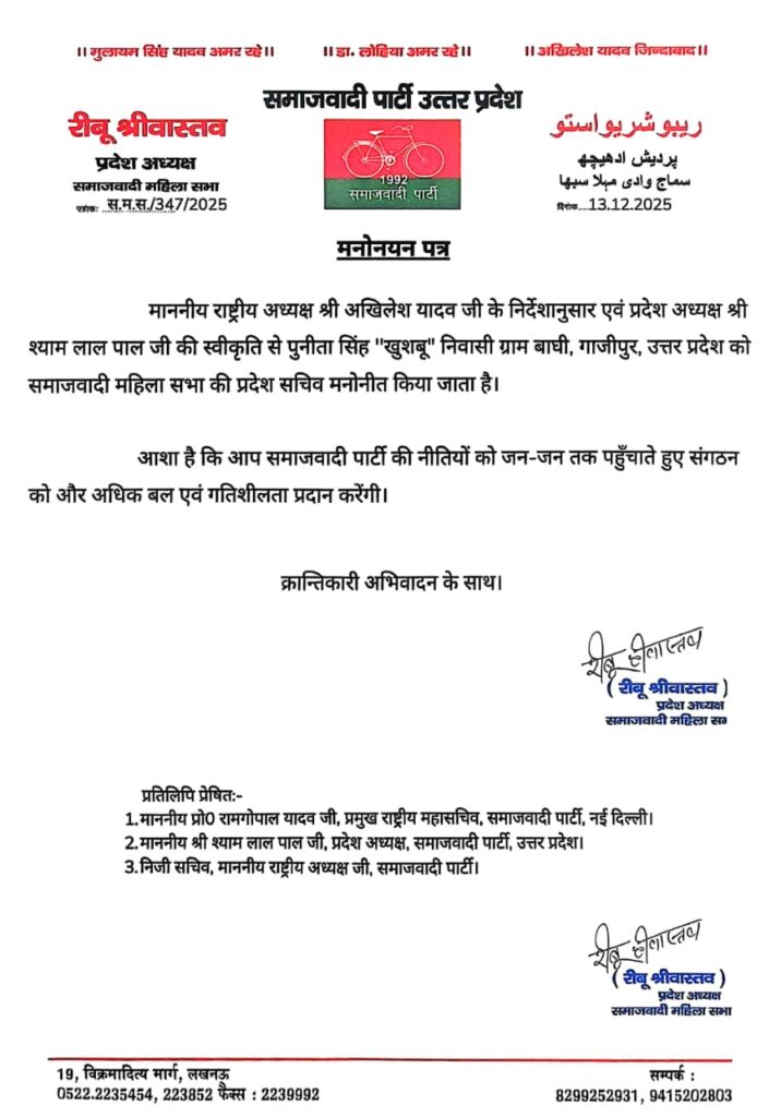 नंदगंज (गाजीपुर)। समाजवादी पार्टी महिला सभा गाजीपुर की बाघी निवासी पुनीता सिंह ‘खुशबू’ को प्रदेश सचिव पद पर उत्तर प्रदेश सरकार की पूर्व मंत्री एवं समाजवादी महिला सभा की प्रदेश अध्यक्ष रीबू श्रीवास्तव ने शनिवार को नियुक्ति पत्र सौंपा है।
