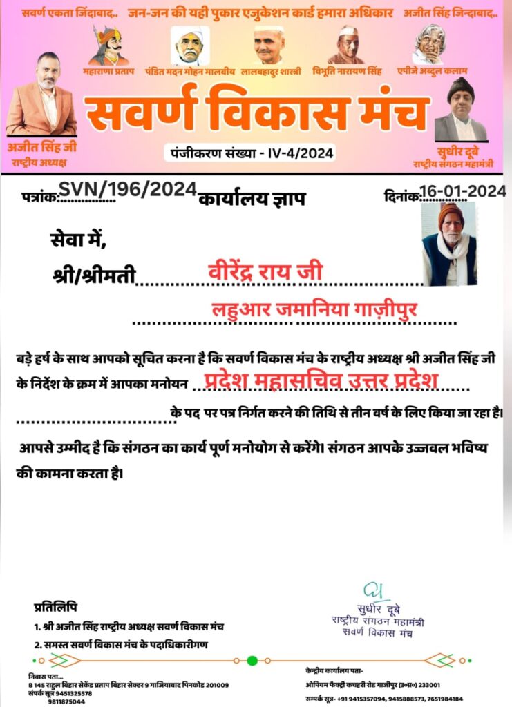 जमानियां (गाजीपुर) जयदेश। सवर्ण विकास मंच के राष्ट्रीय अध्यक्ष अजीत सिंह की सहमति से संगठन में एक महत्वपूर्ण बदलाव किया गया है। संगठन के उत्तर प्रदेश के संगठन मंत्री राजवर्धन सिंह ने बीरेंद्र राय, निवासी लहुआर, जमानियां, गाजीपुर को सवर्ण विकास मंच का प्रदेश महासचिव (उत्तर प्रदेश) नियुक्त किया है।