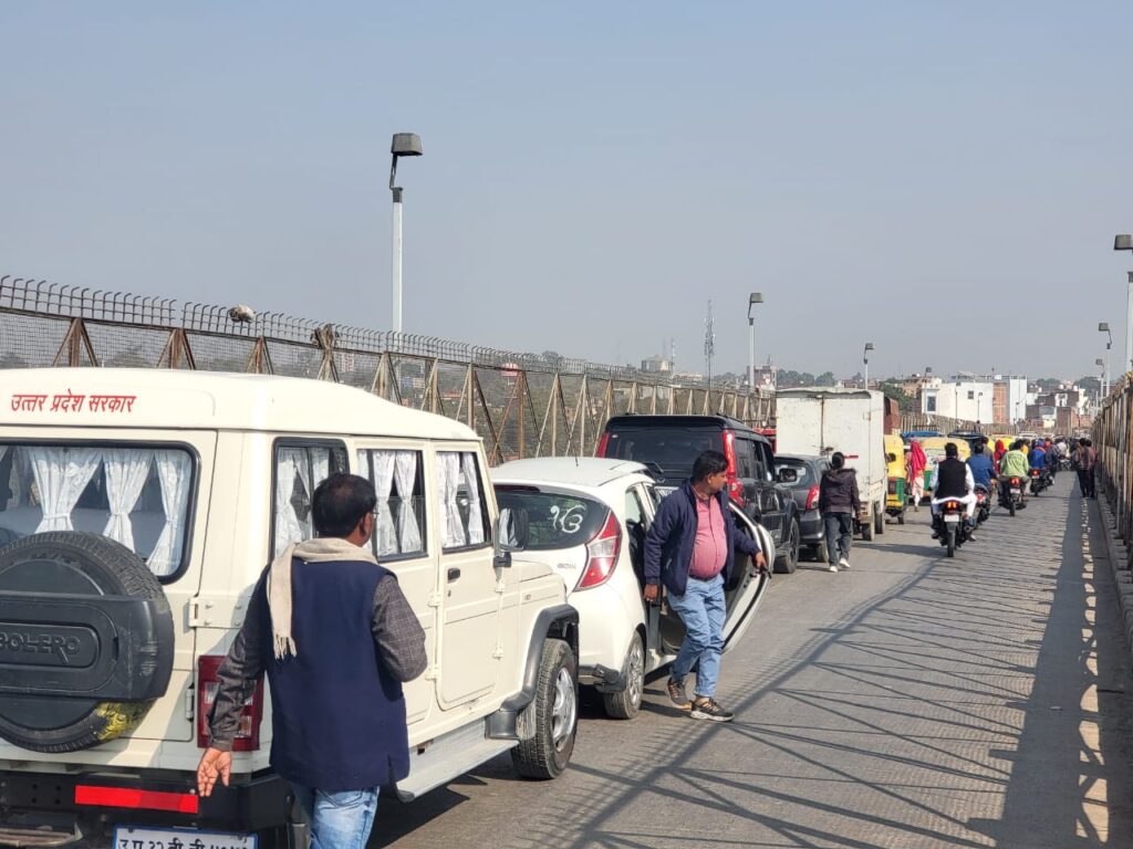 वाराणसी। शनिवार को सामने घाट शास्त्री पुल पर भीषण जाम के कारण तीन घंटे तक आवागमन ठप हो गया। पुल से लेकर रामनगर, लंका, रमना और विश्व सुंदरी तक वाहनों की लंबी कतारें लग गईं। हालात इतने खराब हो गए कि लोग पैदल पुल पार करने पर मजबूर हो गए, जबकि एंबुलेंस और स्कूली बसें घंटों जाम में फंसी रहीं।