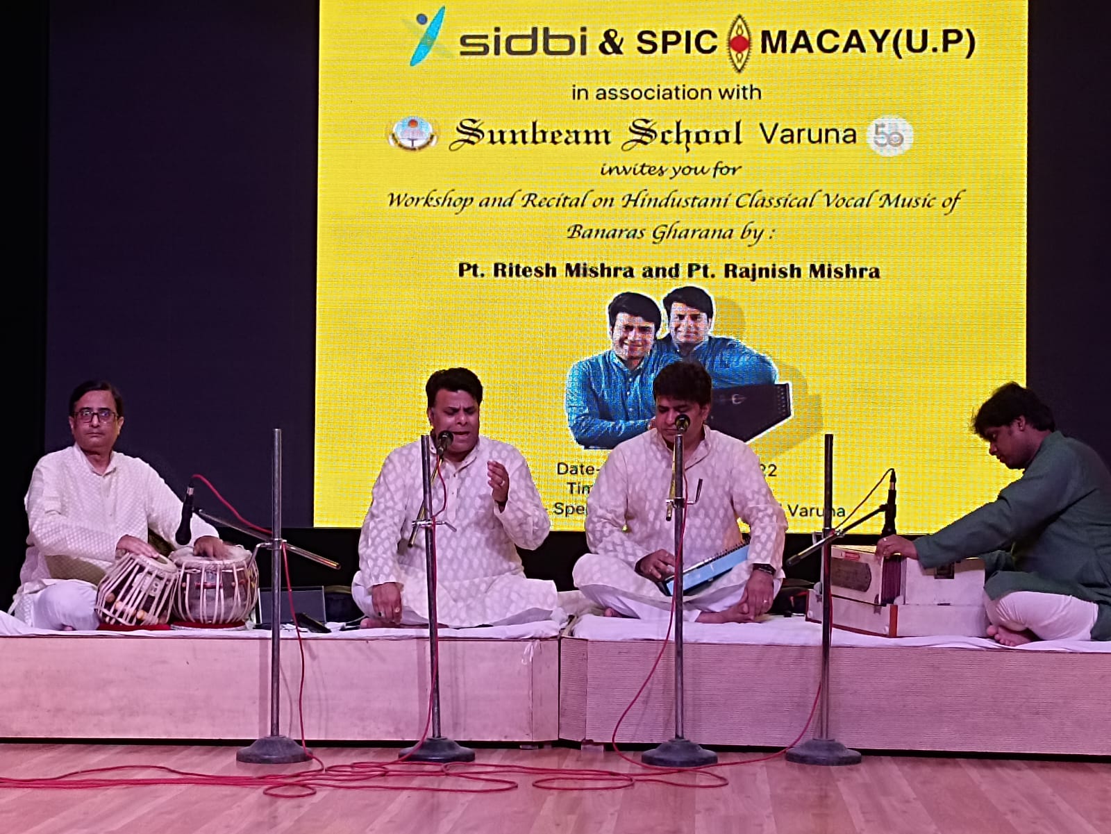वाराणसी।भारत की प्राचीन सांस्कृतिक नगरी काशी अपने बनारस घराने की गायकी के लिए देश ही नहीं विदेशों में भी अपनी छाप छोड़ी है। युवाओं कों अपनी भारतीय संस्कृति के प्रति जागरूक करने और शास्त्रीय संगीत से जोड़ने की पहल सिडबी-स्पिक मैके द्वारा वर्ष भर विभिन्न स्कूल कॉलेजों में बनारस घराने के कलाकारों द्वारा छात्र छात्राओं कों कार्यशाला के माध्यम से शास्त्रीय संगीत से जोड़ने का वीणा उठाया है। शनिवार को सनबीम वरुणा एवं सनसिटी में आयोजन हुआ जिसमें बनारस घराने के युवा गायकों पं. रजनीश मिश्र-पं. रितेश मिश्र के शास्त्रीय गायन की प्रस्तुति हुई। दोनों ने मिलकर महफिल कों अपनी मनमोहक गायकी से मंत्र मुग्ध कर दिया। उन्होंने राग ललित में दो रचनाएँ जोगिया मेरे घर घर आये.. घर घर अलख जगाये और द्रुत लय एक ताल में जाने ना दूंगी कान्हा बंसिया बजाये बिना अपने अपने अंदाज में गाकर श्रोताओं पर बनारस घराने की गायकी की छापo छोड़ गए।जय माँ सरस्वती संगीत की तू देवी सातों सुर को हम लेकर करें आराधना तेरी पर