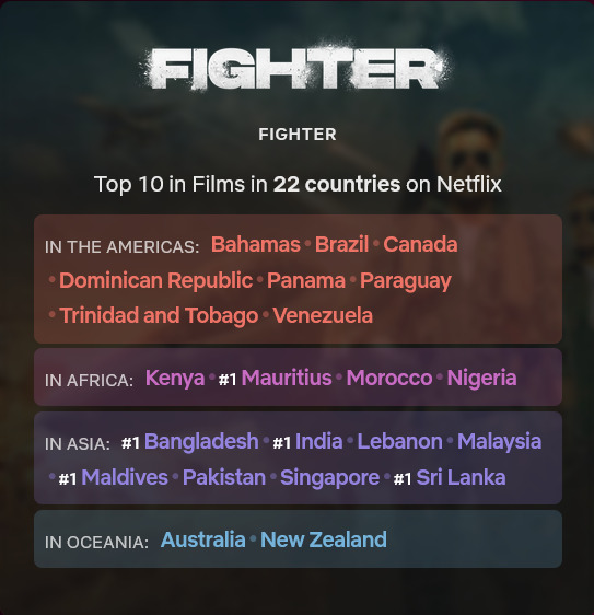 सिद्धार्थ आनंद की फाइटर ओटीटी पर नंबर 1 पर कायम; 22 देशों में शीर्ष 10 चार्ट