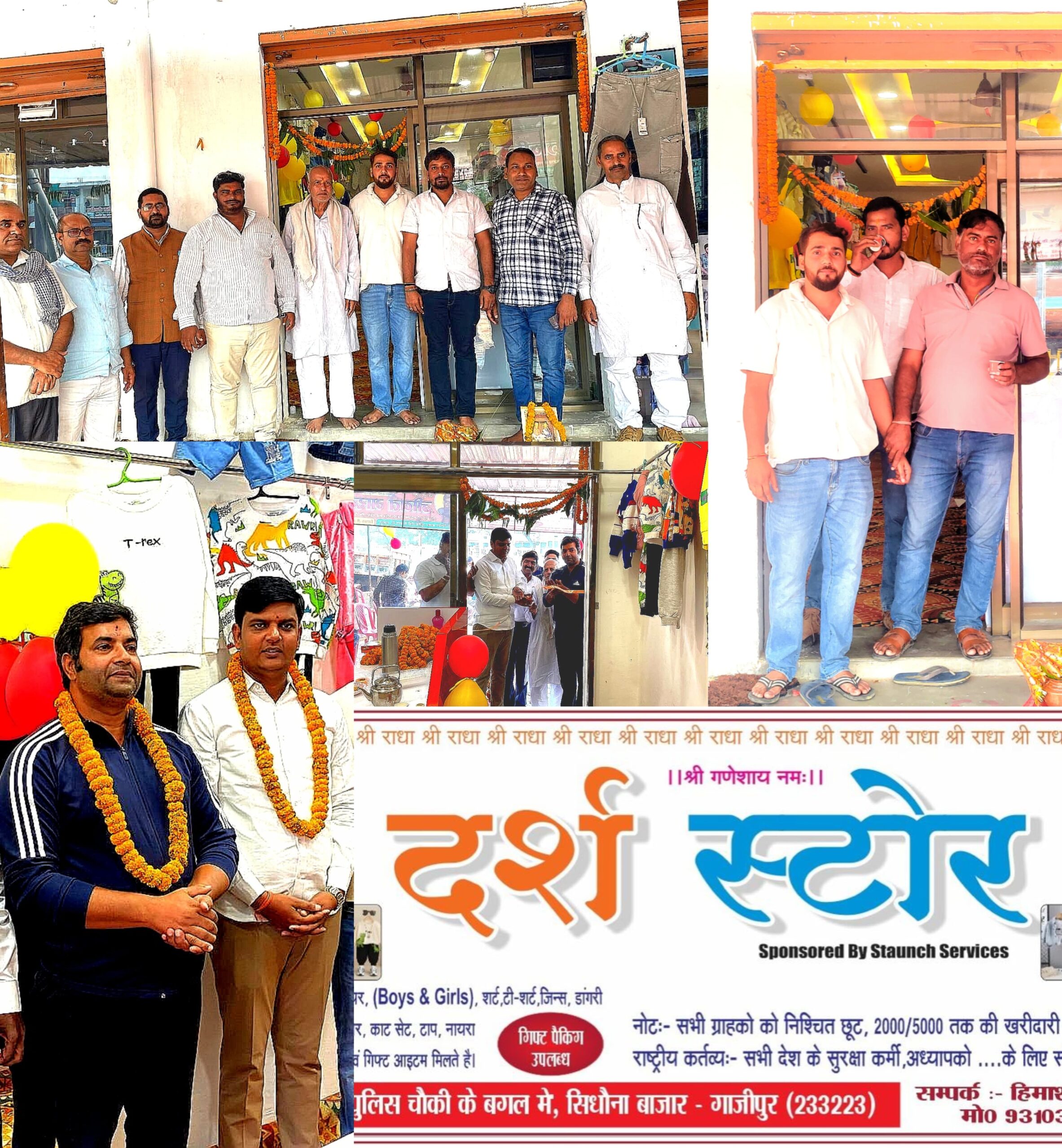 सिधौना (गाजीपुर)। जिला पंचायत सदस्य कमलेश यादव राय साहब तथा सपा जिला उपाध्यक्ष आशीष यादव राहुल ने नए प्रतिष्ठान का उद्घाटन किया। सिधौना बाजार में खरीदारी के शौकीनों के लिए खुशखबरी। अब क्षेत्र में खुल गया है नया प्रतिष्ठान “दर्श स्टोर”। इस स्टोर के प्रॉपराइटर हिमांशु यादव हैं। यह प्रतिष्ठान सिधौना पुलिस चौकी के बगल में स्थित है और लोगों के लिए सभी सिजनी कपड़े व गिफ्ट आइटम्स की विस्तृत रेंज उपलब्ध है।