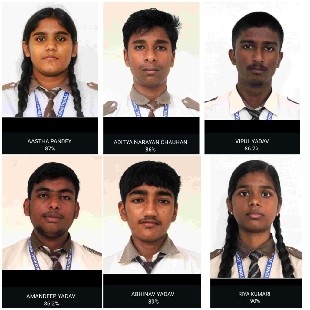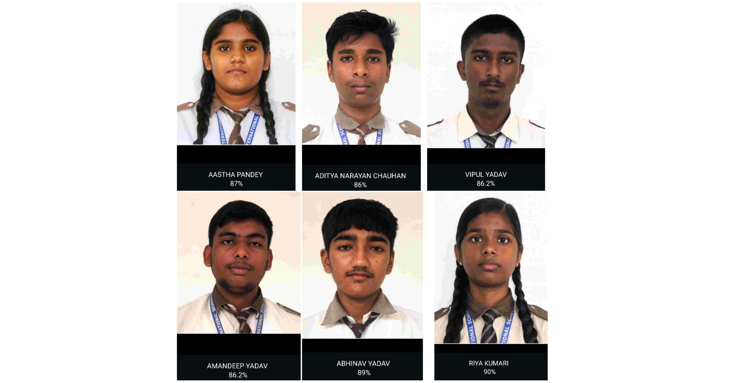 इस उल्लेखनीय सफलता में विद्यालय की छात्रा रिया कुमारी ने 90% अंक प्राप्त कर प्रथम स्थान हासिल किया। अभिनव यादव ने 89% अंक प्राप्त कर द्वितीय स्थान तथा आस्था पांडे ने 87% अंक के साथ तृतीय स्थान प्राप्त किया। चतुर्थ स्थान पर संयुक्त रूप से अमनदीप यादव एवं विपुल यादव ने 86.2% अंक प्राप्त किए, जबकि पंचम स्थान पर आदित्य नारायण चौहान ने 86% अंक अर्जित किए।