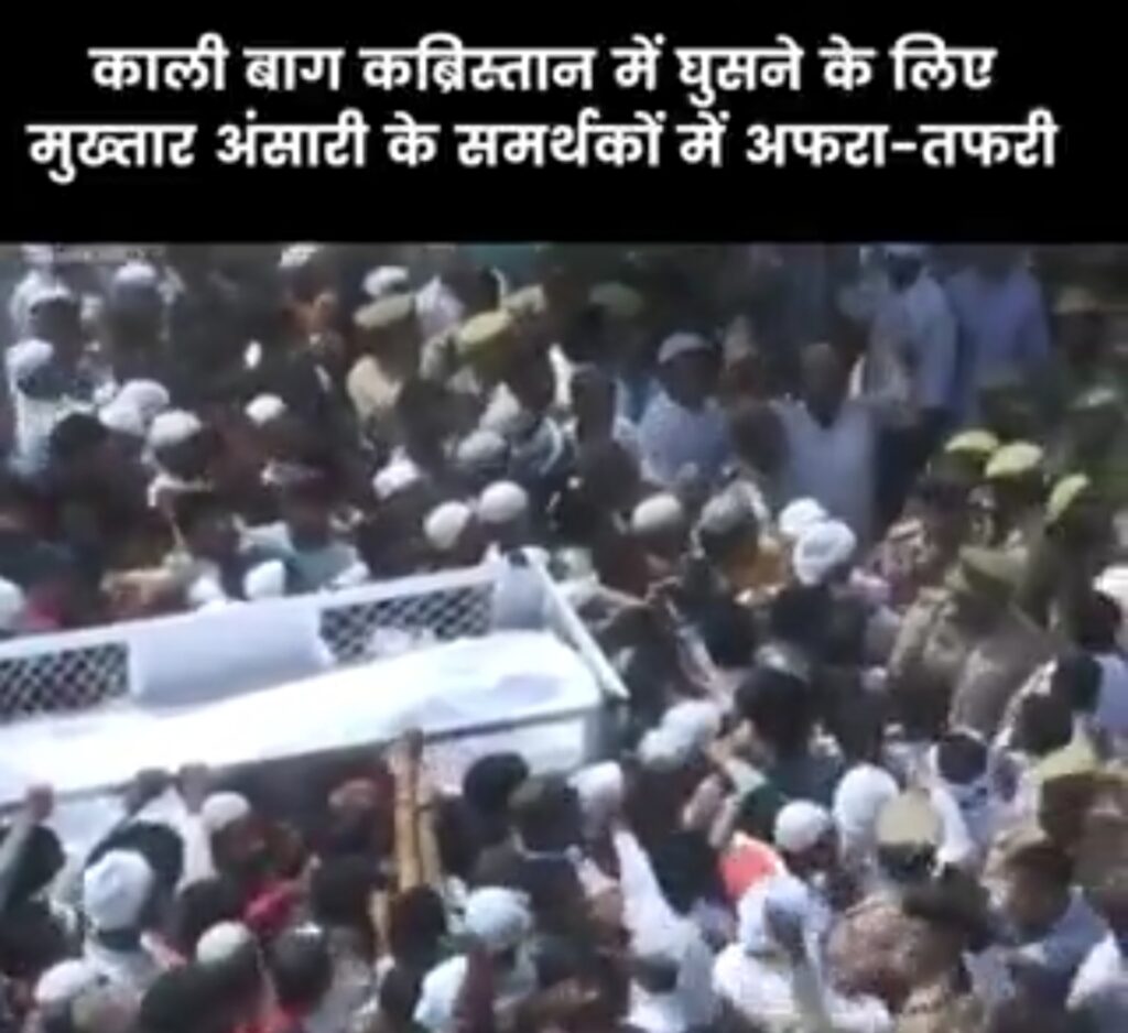 पूर्वांचल के बाहुबली माफिया मुख्तार अंसारी को शनिवार को उनके गृह जनपद गाजीपुर स्थित काली बाग कब्रिस्तान में सुपुर्द-ए-खाक कर दिया गया। पैतृक घर जिसे बड़ा फाटक कहते हैं, वहां मुख्तार का शव अंतिम दर्शन के लिए रखा गया था। बेटे उमर ने जनाजे पर इत्र छिड़का और आखिरी बार अपने वालिद के मूछों पर ताव दिया। मुख्तार के जनाज़े के साथ कब्रिस्तान के अंदर जाने के लिए सिर्फ़ परिजनों को ही इजाजत थी, लेकिन काली बाग कब्रिस्तान में घुसने के लिए मुख्तार अंसारी के समर्थकों में अफरा-तफरी मच गई।