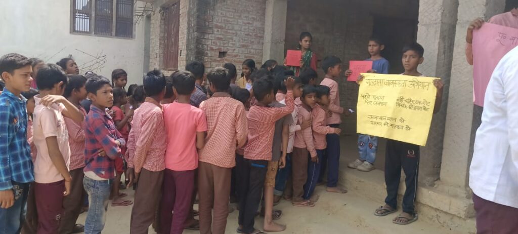 चंदौली। एक जून को जनपद चंदौली में लोकसभा निर्वाचन में शत् प्रतिशत मतदान के लिए संकल्पित जिला निर्वाचन अधिकारी निखिल टी. फुंडे के निर्देशानुसार शनिवार को खेदाई नारायणपुर गांव में प्राथमिक विद्यालय में बच्चो द्वारा मतदाता जागरूकता कार्यक्रम का आयोजन किया गया। कार्यक्रम की शुरुआत पूर्व प्रधान अशोक यादव के द्वार के सामने नुक्कड़ नाटक किया गया वहीं मतदाता शपथ पहले मतदान,फिर जलपान के साथ की गई।