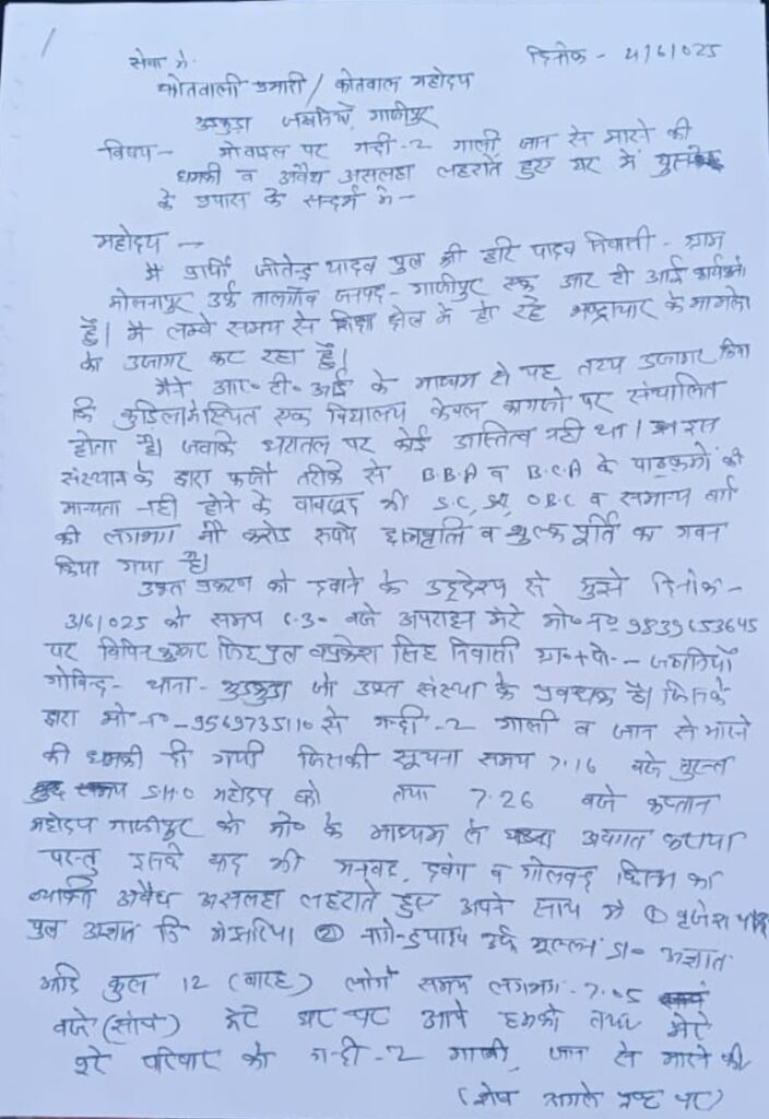 गाजीपुर। भुड़कुडा कोतवाली क्षेत्र अंतर्गत जखनिया स्थित द सन साइन स्कूल के प्रबंधक एवं भाजपा जिला उपाध्यक्ष विपिन सिंह और सामाजिक कार्यकर्ता जितेंद्र यादव (निवासी तालगांव, मोलनापुर) के बीच वर्षों पुरानी रंजिश एक बार फिर तूल पकड़ गई है। स्कूल की जांच और जमीन से जुड़े विवाद को लेकर दोनों पक्षों के बीच पहले से ही तनाव था, जिसका मामला उच्च न्यायालय और जन सूचना अधिकारी के समक्ष विचाराधीन है।