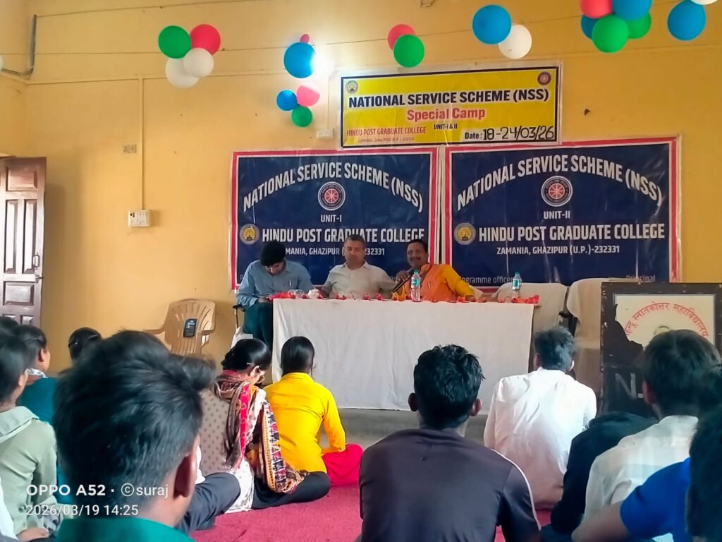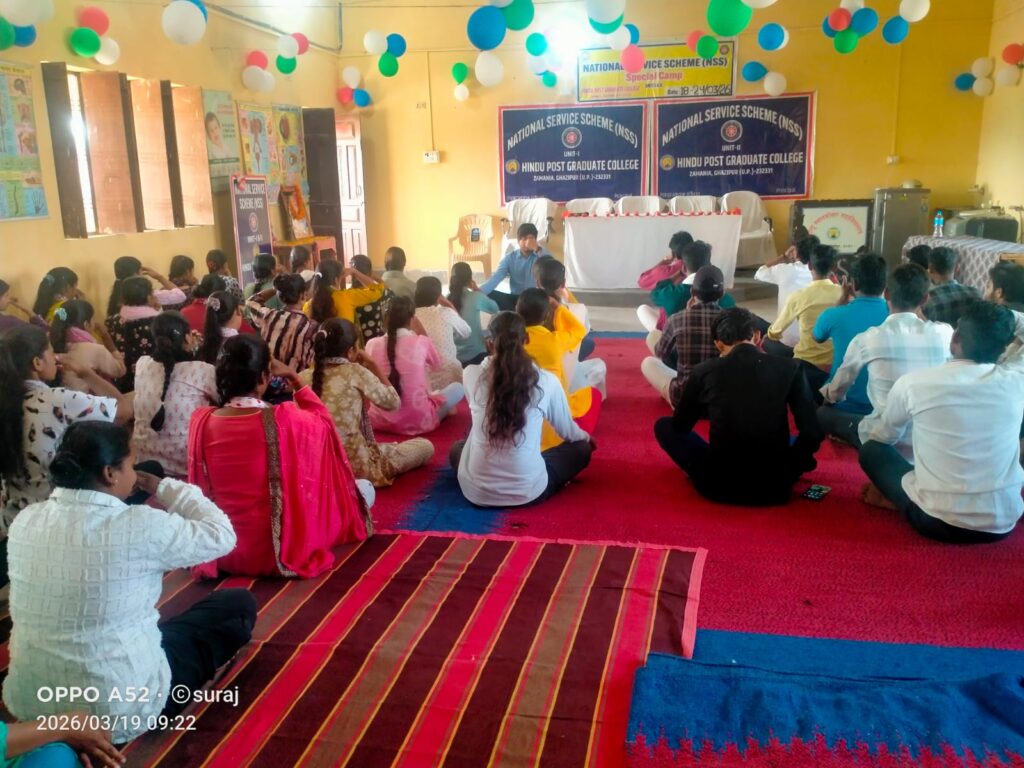 जमानिया (गाजीपुर) जयदेश। हिंदू स्नातकोत्तर महाविद्यालय में चल रहे राष्ट्रीय सेवा योजना के विशेष शिविर के दूसरे दिन बृहस्पतिवार के कार्यक्रम की शुरुआत प्रातःकाल योग, प्राणायाम, प्रार्थना तथा व्यायाम से हुई, जिससे स्वयंसेविकाओं में शारीरिक और मानसिक ऊर्जा का विकास हुआ। इसके पश्चात स्वयंसेविकाओं ने परिसर में स्वच्छता अभियान चलाकर स्वच्छ वातावरण बनाए रखने का संदेश दिया। इसके पश्चात डॉ. विजय श्याम पांडेय ने स्वयंसेविकाओं को NSS का लक्ष्य गीत सिखाया। साथ ही विद्यार्थियों को कविता, भाषण, नृत्य और गीत के लिए विषय दिए गए, जिनमें राष्ट्रवाद, दहेज प्रथा, महिला सशक्तिकरण, शिक्षा और प्रेरणा जैसे सामाजिक विषय शामिल थे।इसके बाद डॉ. अभिषेक तिवारी ने स्वयंसेविकाओं को NSS के बारे में विस्तृत जानकारी दी।