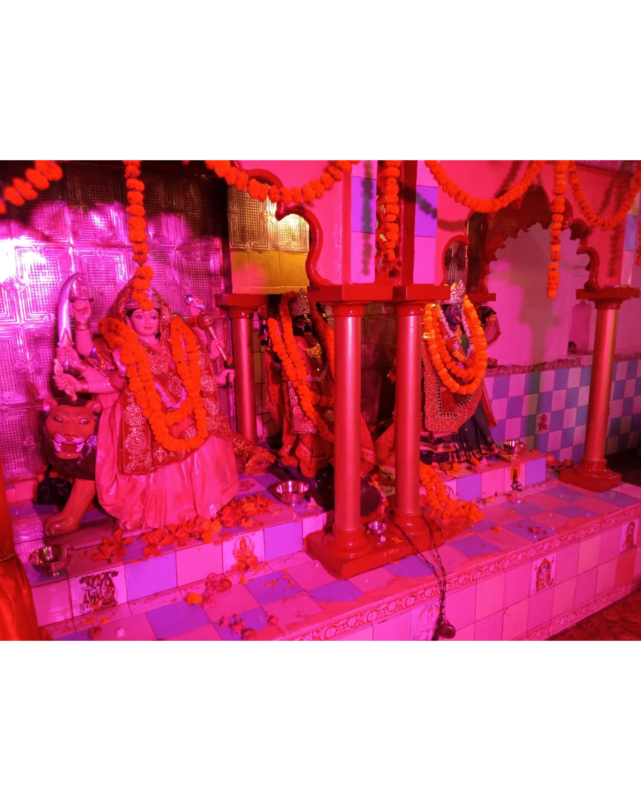 मंदिर में सबसे पहली प्रतिमा शव के ऊपर स्थापित है। इस मूर्ति के बारे में अपने गुरुजी महाराज द्वारा सुनी कथा का जिक्र करते हुए उन्होंने बताया कि सैकड़ों वर्ष पूर्व स्थापित इस प्रतिमा की एक अंगुली किसी कारणवश टूट गई। इसकी जानकारी होने पर उनके गुरुजी महाराज ने खंडित प्रतिमा के स्थान पर दूसरी प्रतिमा स्थापित कराने की मंशा के तहत प्रतिमा हटवाने का काम शुरू कराया। जैसे ही मजदूरों ने प्रतिमा हटाना शुरू किया, वैसे ही मंदिर की छत से रक्त टपकने लगा। यह देखकर मजदूरों ने काम रोक दिया और गुरुजी महाराज को भी इस बात का अनुभव हुआ तो वे तुरंत मंदिर की तरफ दौड़ पड़े।