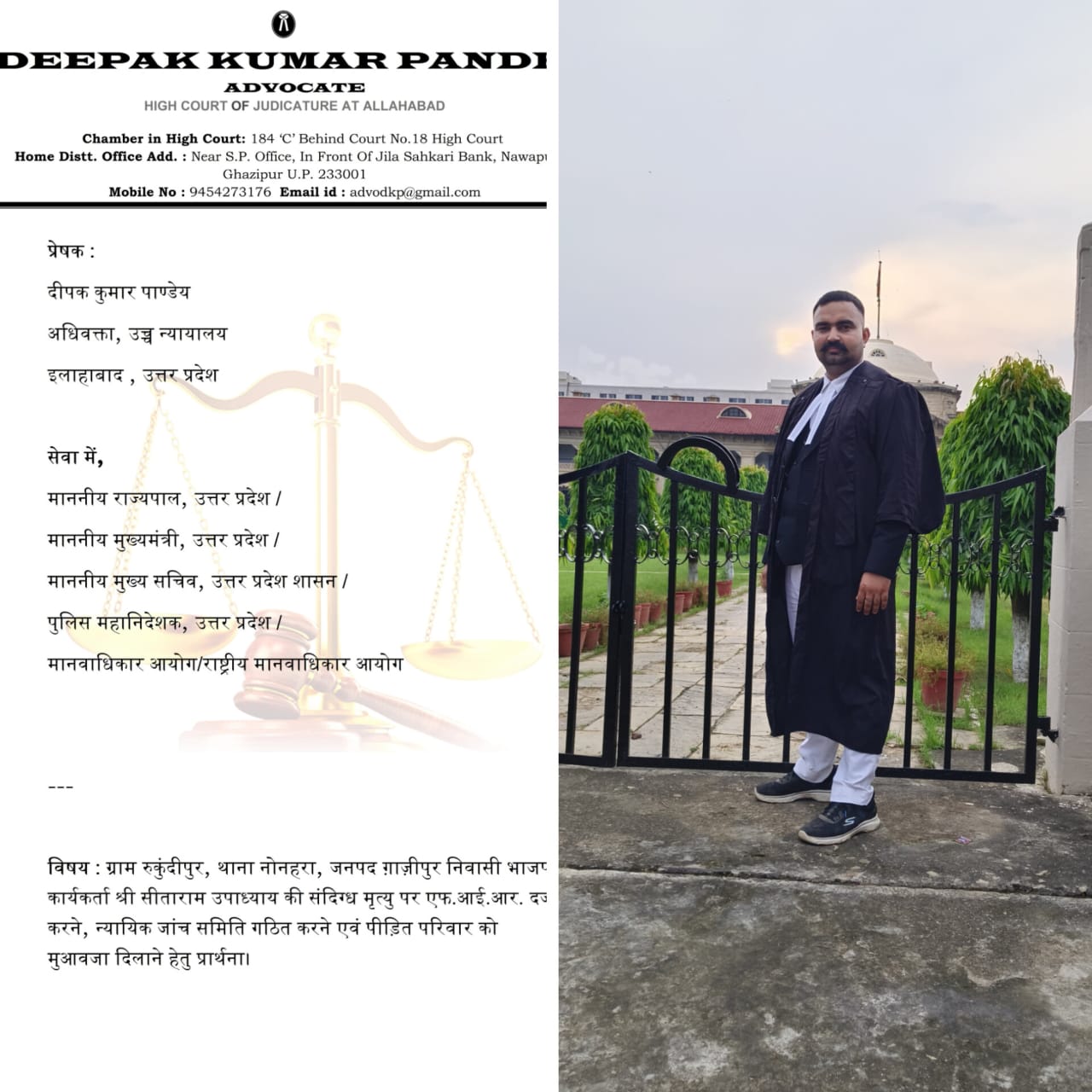इस पूरे प्रकरण में दीपक कुमार पांडेय एडवोकेट हाईकोर्ट इलाहाबाद ही वह मज़बूत आवाज़ बने, जिन्होंने मामले को दबाने की कोशिश का पर्दाफ़ाश किया और संवैधानिक अधिकारों का हवाला देकर सरकार को मजबूर किया कि SIT जांच हो। आज पूरे गाज़ीपुर में उन्हें ही न्याय की लड़ाई का असली सेनानी माना जा रहा है।