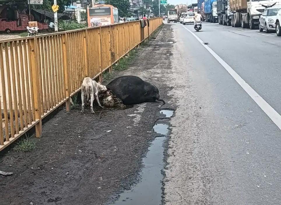हाईवे पर मृत गाय को कुत्ते कर रहे क्षत-विक्षत, प्रशासन मौन