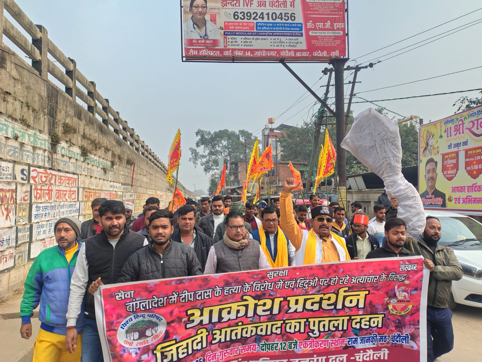 चंदौली। नगर पंचायत स्थित श्री राम जानकी श्रीमती मंदिर से विश्व हिंदू परिषद व बजरंग दल की ओर से गुरुवार को बांग्लादेश के विरोध में आक्रोश मार्च निकाला गया। हिंदू संगठनों ने बांग्लादेश में हिंदुओं पर हो रहे अमानवीय व्यवहार व अत्याचार की कड़े शब्दों में निंदा की। श्री राम जानकी शिवमठ मंदिर परिसर से जुलूस निकालकर नगर भ्रमण करते हुए सदर तहसील के समीप पहुँचे, जहाँ बांग्लादेश का पुतला दहन कर जमकर नारेबाजी की गई।