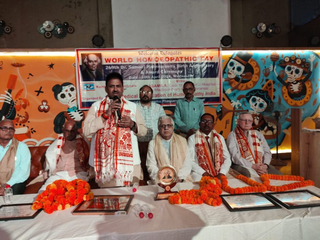 वाराणसी। मेडिकल एसोसिएशन ऑफ इंडिया के तत्वावधान में होम्योपैथिक के जन्मदाता डॉक्टर हैनिमैन का 269 वां जन्म दिवस बुधवार की शाम विश्व होम्योपैथिक दिवस एवं सम्मान समारोह के रुप में मकबूल आलम रोड स्थित एक रेस्टोरेन्ट में धूमधाम से मनाया गया | उक्त अवसर पर समारोह के मुख्य अतिथि महेश चन्द्र श्रीवास्तव पूर्व अध्यक्ष काशी प्रांत भारतीय जनता पार्टी व संस्था के राष्ट्रीय संयोजक डॉक्टर एके सिंह , वरिष्ठ चिकित्सक डॉक्टर पी के मुखर्जी, डॉ एस के एल श्रीवास्तव, डॉक्टर जी एस मौर्य, डॉ आर पी सिंह, डॉक्टर फौजदार सिंह व अन्य मंचासिन अतिथियों द्वारा दीप प्रज्ज्वलितोपरांत महात्मा हैनिमैन की प्रतिमा पर माल्यार्पण कर समारोह का शुभारंभ किया गया | तदोपरांत उपस्थित होम्योपैथिक चिकित्सकों द्वारा महात्मा हैनिमैन को पुष्पांजलि अर्पित किया गया |