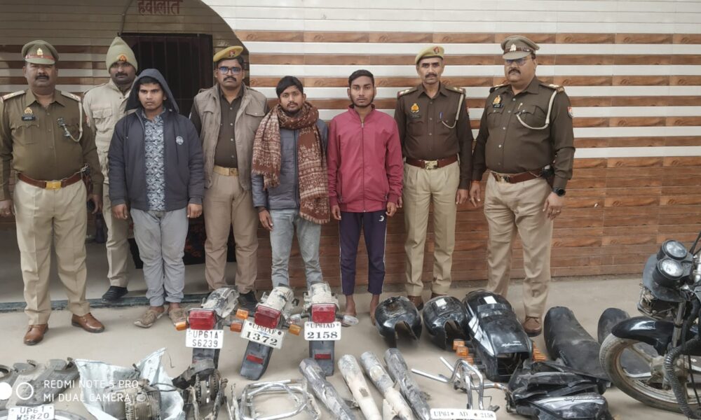 चोरी की बाइक और पार्ट्स बरामद नंदगंज (गाजीपुर)। स्थानीय पुलिस ने बीती रात हरिहरपुर बाजार के बॉर्डर पर ग्राम हाला स्थित एक बाइक मरम्मत की दुकान...