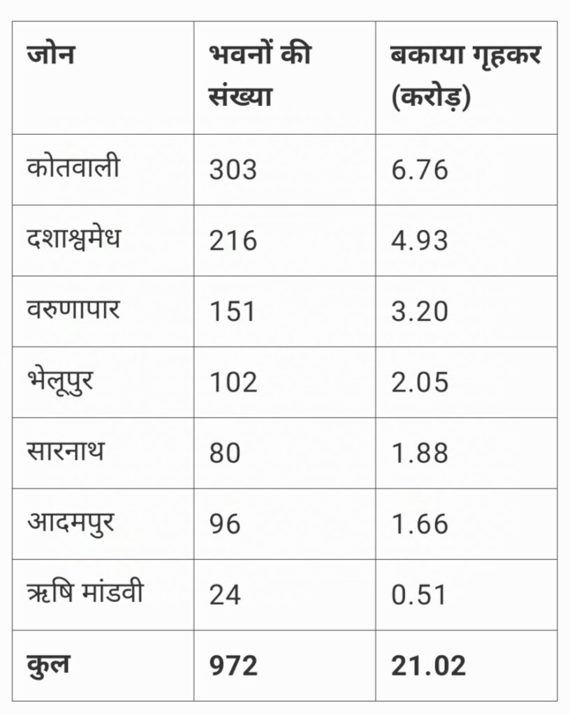 वाराणसी। नगर निगम जल्द ही एक लाख रुपये से अधिक के गृहकर बकाया रखने वाले 972 भवन स्वामियों को नोटिस जारी करेगा। इन पर कुल 21.02 करोड़ रुपये बकाया है। बकायेदारों की सूची जोनवार नगर निगम कार्यालयों में चस्पा की जाएगी। इसके बाद भी अगर बकाया जमा नहीं किया गया तो कुर्की और नीलामी की कार्रवाई होगी।